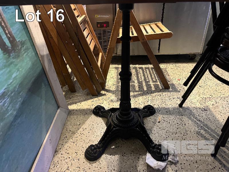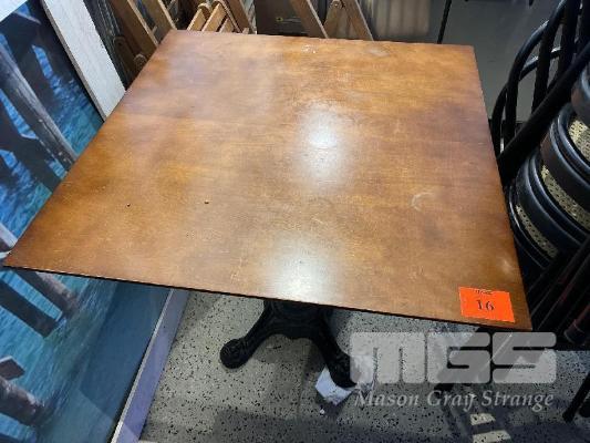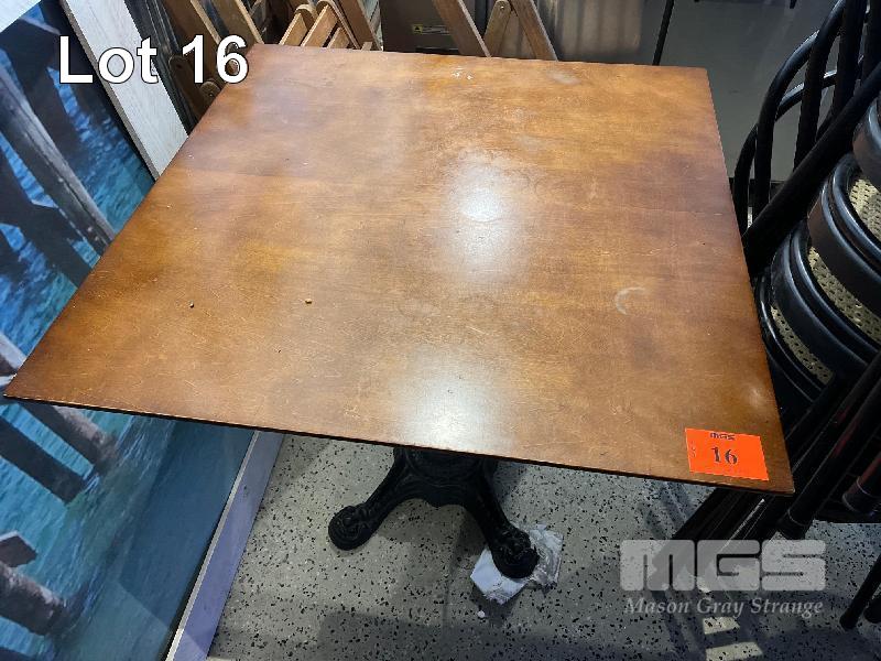 2 x TIMBER TOP ORNATE TABLES, PEDESTAL BASE, 800 x 800mm