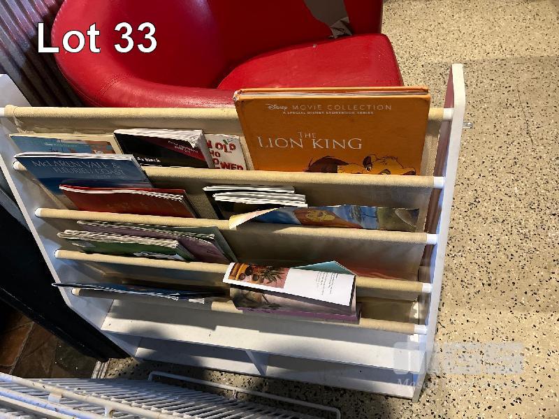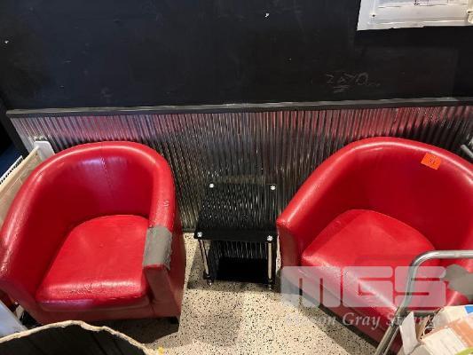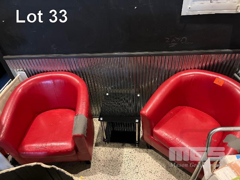 PAIR RED VINYL CHAIRS, SMALL COFFEE TABLE & BOOK STAND