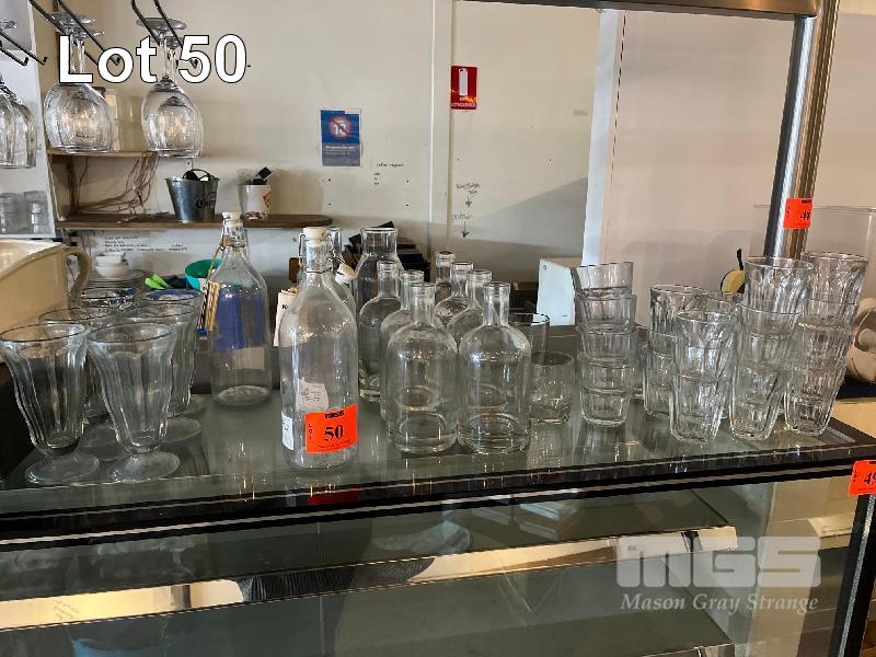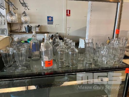 40 (APPROX) x ASSORTED GLASSES & TABLE BOTTLES, DESSERT GLASSES, TUMBLERS, ETC