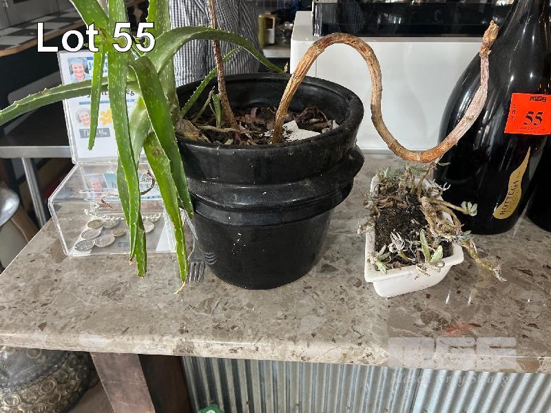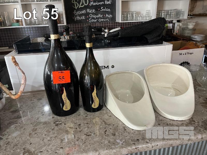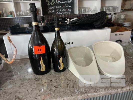 2 x ORNAMENTAL CHINA BOWLS, 2 x BOTTEGA MAGNUM BOTTLES & 2 x POTTED PLANTS