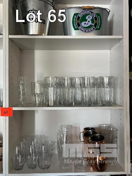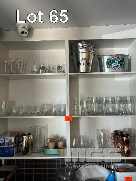 CORONA BUCKETS, "ICE", SHOT GLASSES, SHAKE GLASSES, VARIOUS MUGS & CUPS CONTENTS 2 x WALL MOUNT SHELVES