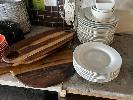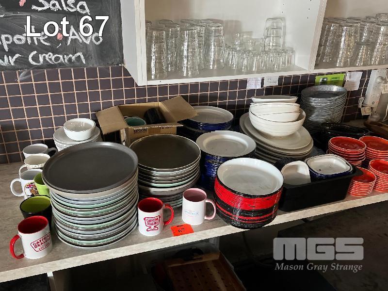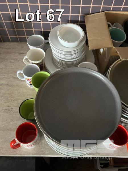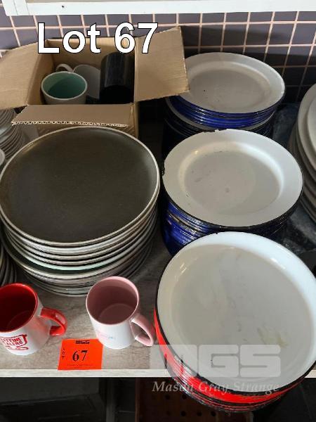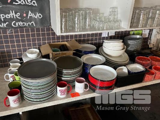 40 (APPROX) x STONE DINNER PLATES, ENAMEL PLATES, SAUCERS, CUPS & MORE, 200 PIECES APPROX