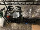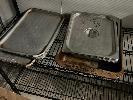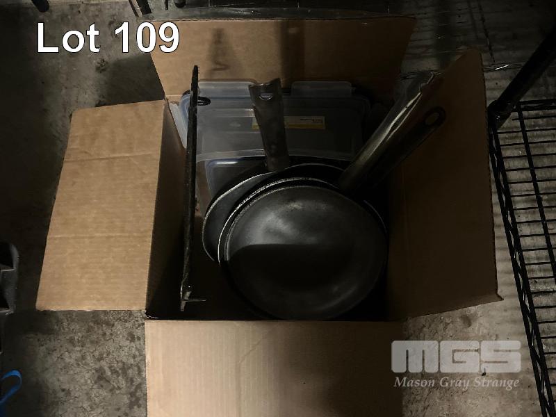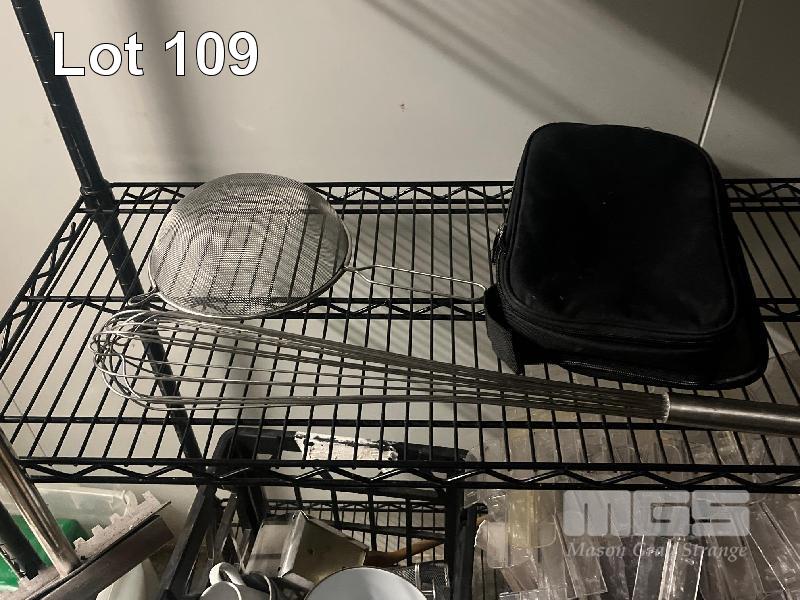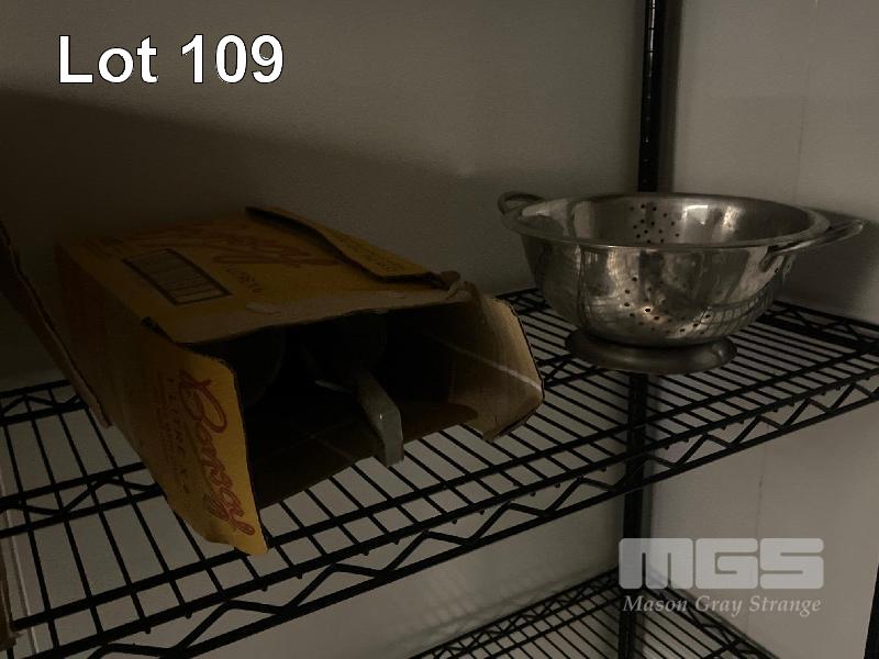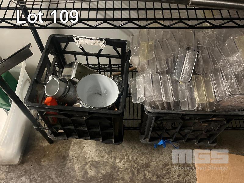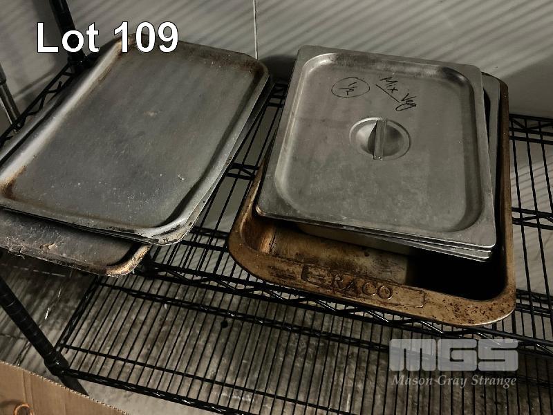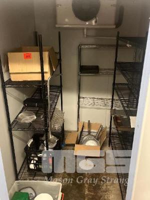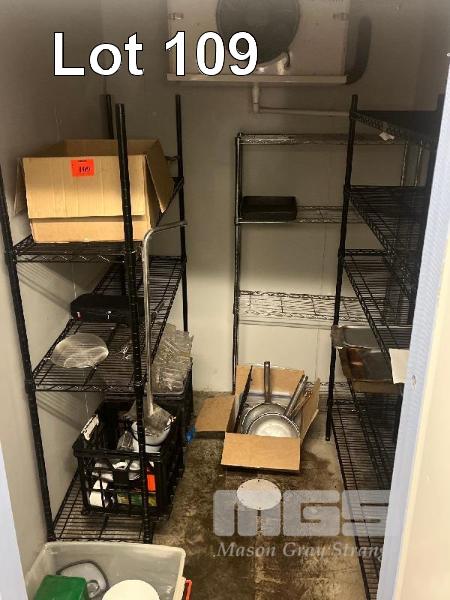 CONTENTS OF COOL ROOM INCLUDING, 2 x MODULAR STEEL MESH STOCK RACKS, ASSORTED KITCHENWARE, FRY PANS, WHISK, SIEVE, STAINLESS STEEL & ALLOY TRAYS