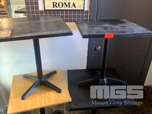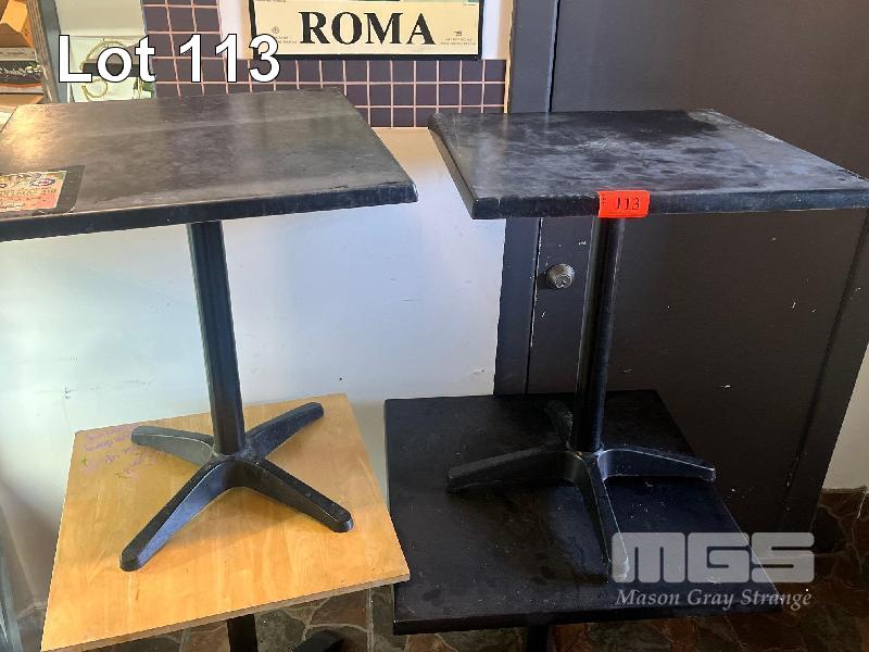 3 x BLACK TABLES & 1 x TIMBER TABLE, PEDESTAL BASE