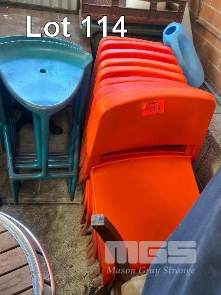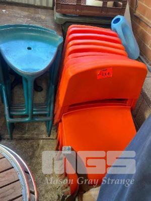 13 x ORANGE PLASTIC CAFE CHAIRS & 5 x GREEN PLASTIC STOOLS