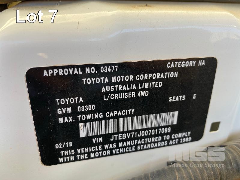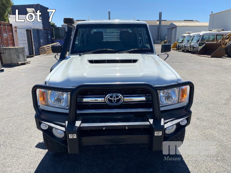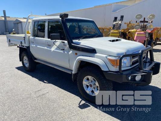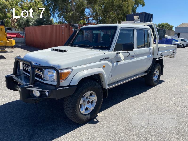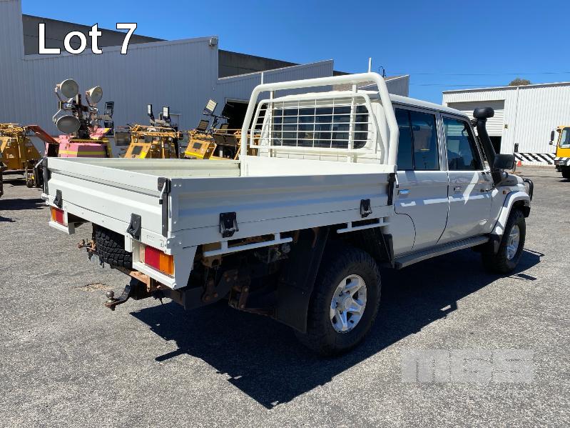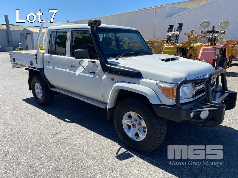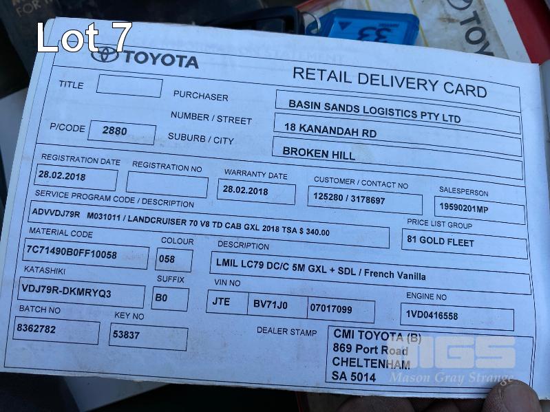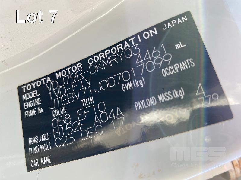 2017 TOYOTA LANDCRUISER VDJ79R-DKMRYQ3, 79 SERIES, DUAL CAB TRAY TOP 4x4 REG: NO PLATES VIN: JTEBV71J007017099 ENG: 1VD0416558 ODO: 187,423kms SHOWING 4.5 LITRE V8 TURBO DIESEL, 5 SPEED MANUAL TRANSMISSION, WHITE DUCO, 4 DOORS, 5 SEAT, 4x4 AIR BAG, AIR CON, ALLOY WHEELS, BULL BAR, CARGO BARRIER, CD PLAYER, CENTRAL LOCKING, CRUISE CONTROL, IMMOBILISER, POWER STEERING, POWER WINDOWS, SIDE STEP, SPARE WHEEL, STEEL TRAY, TOW PACK SNORKEL INTAKE BATTERY ISOLATION SWITCH KEY #33 (WITH 1 KEY/S, WITH OWNER'S MANUAL, WITH SERVICE BOOKS)