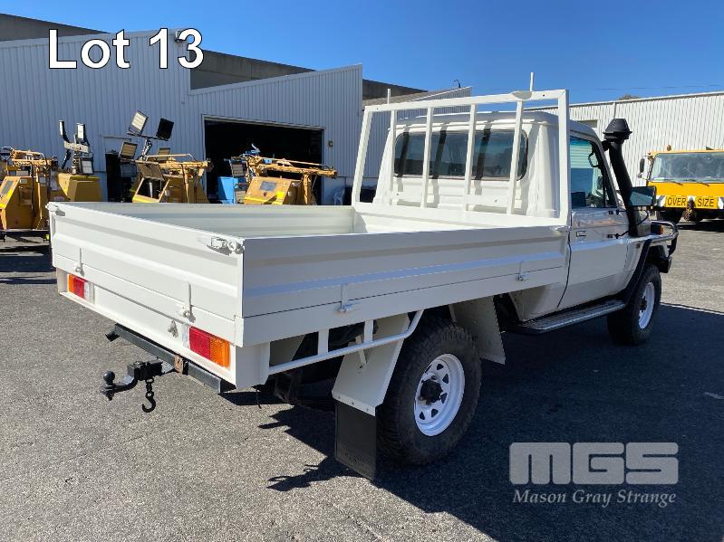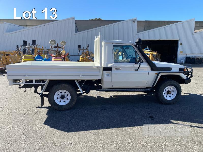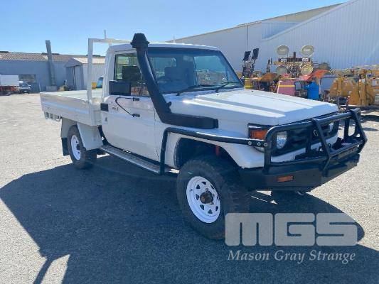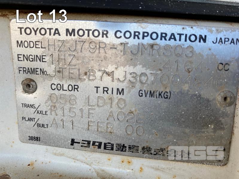2000 TOYOTA LANDCRUISER HZJ79R-TJMR03 SINGLE CAB TRAYTOP 4x4 REG: NO PLATES VIN: JTELB71J307004246 ODO: 452,654kms SHOWING 6 CYLINDER DIESEL, 5 SPEED MANUAL TRANSMISSION, WHITE DUCO, 2 DOORS, 2 SEAT, 4x4 AIR CON, BULL BAR, CARGO BARRIER, SIDE STEP, STEEL TRAY, TOW PACK 2 WAY RADIO KEY #39 (WITH PAPERS, WITH 1 KEY/S)