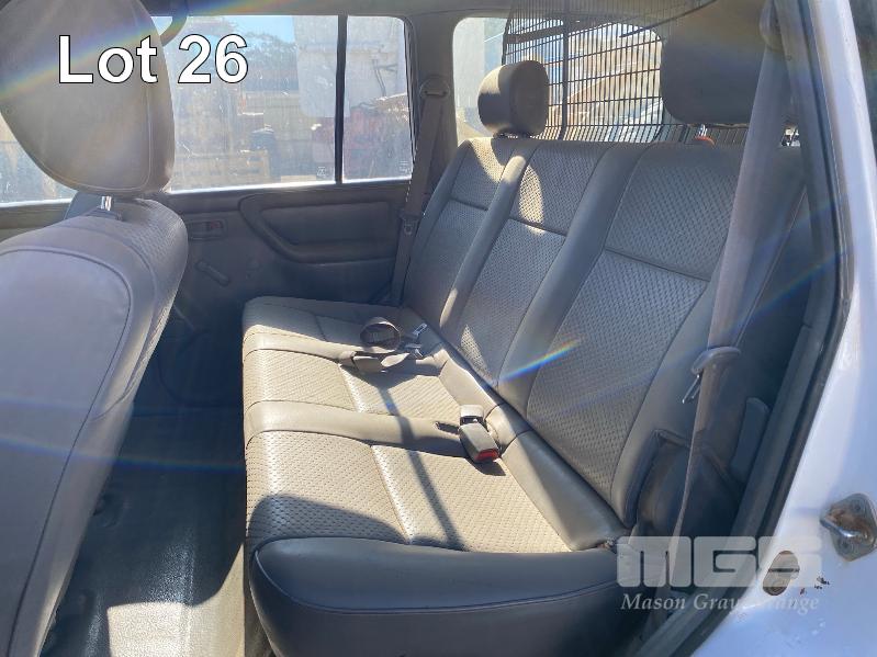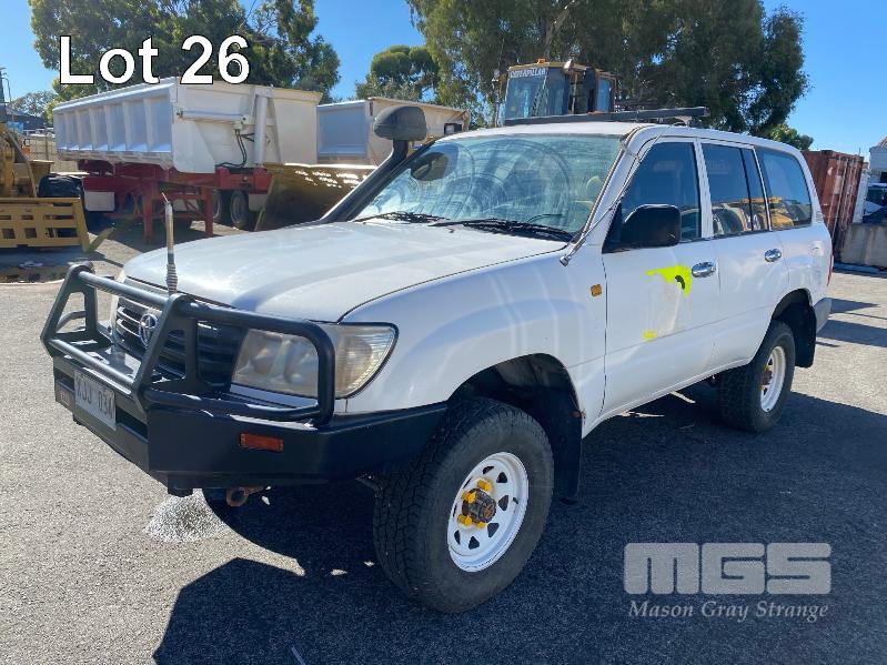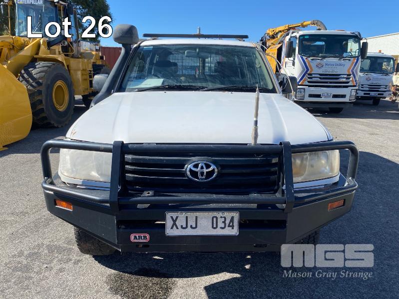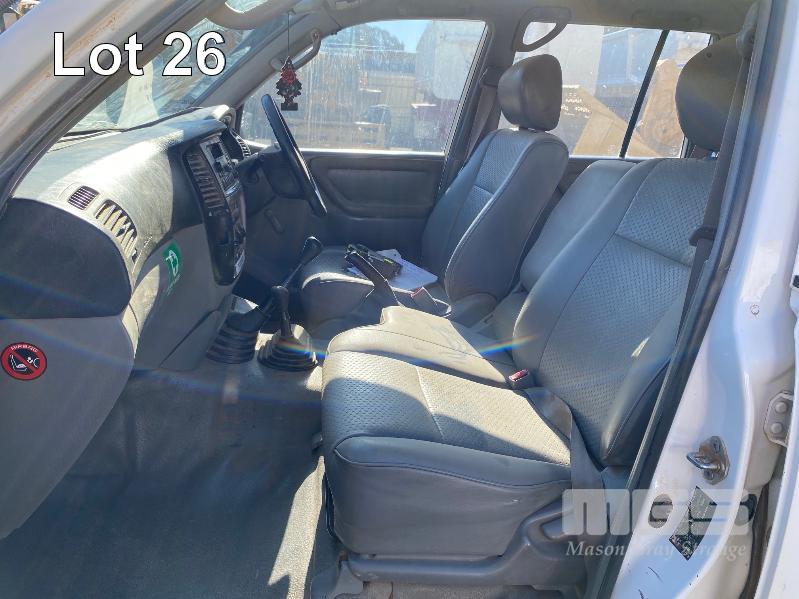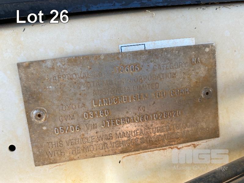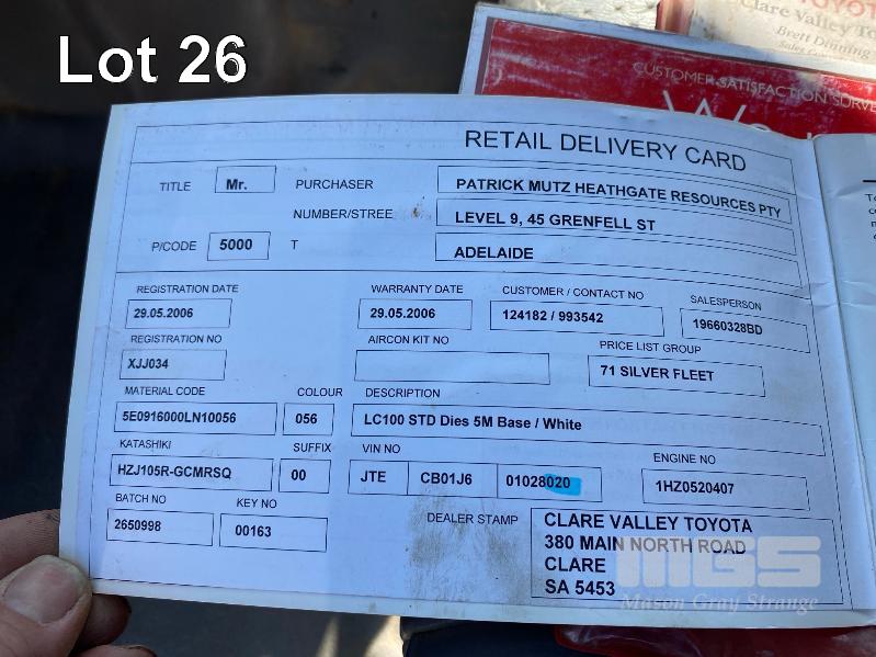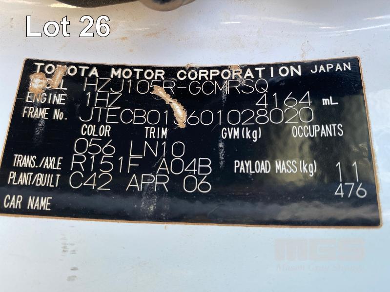 2006 TOYOTA LANDCRUISER HZJ105R-GCMRSQ 100 SERIES STATION WAGON 4x4 REG: XJJ 034 (SA) VIN: JTECB01J601028020 ENG: 1HZ0520407 ODO: 223,071 kms SHOWING PLANT NO: LV28 4.2 LITRE, 6 CYLINDER, 5 SPEED MANUAL, DIESEL, WHITE DUCO, 4 DOORS, 6 SEAT, 4x4 AIR BAG, AIR CON, BULL BAR, CARGO BARRIER, DECALS, POWER STEERING, SNORKLE AIR INTAKE KEY #12 (WITH PAPERS, WITH 1 KEY/S, WITH OWNER'S MANUAL, WITH SERVICE BOOKS) CONDITION: REAR DOORS - FAULTY HANDLE, CAN NOT OPEN BODY - MINOR DENTS & SCRATCHES