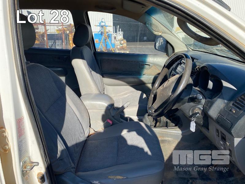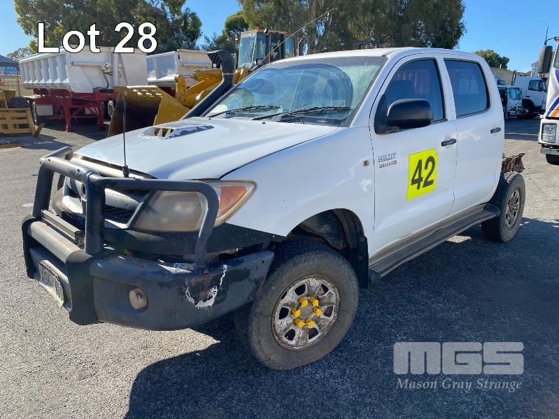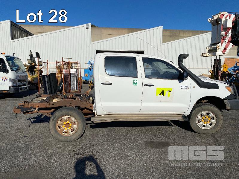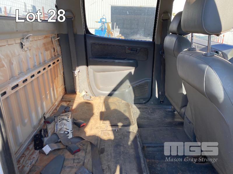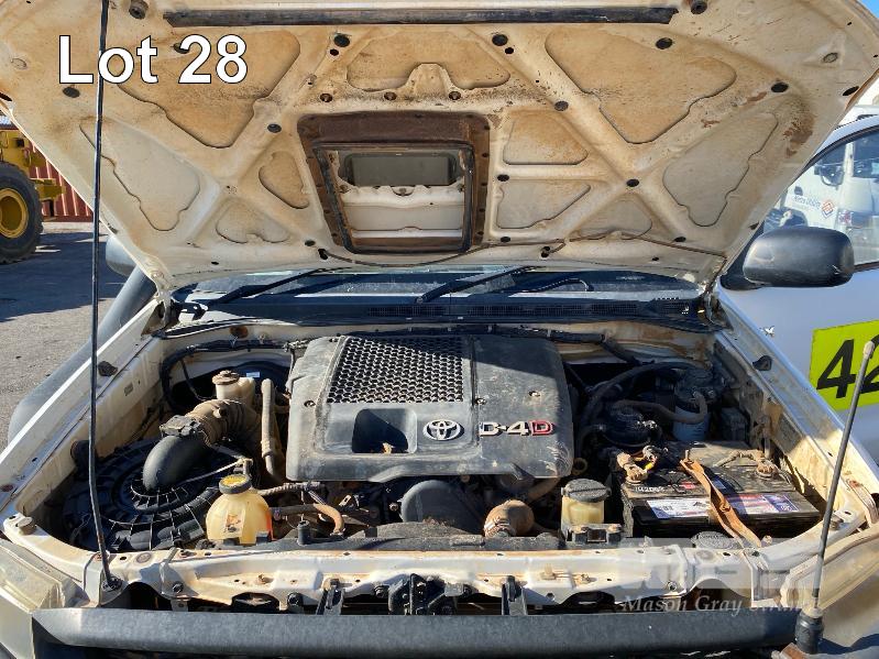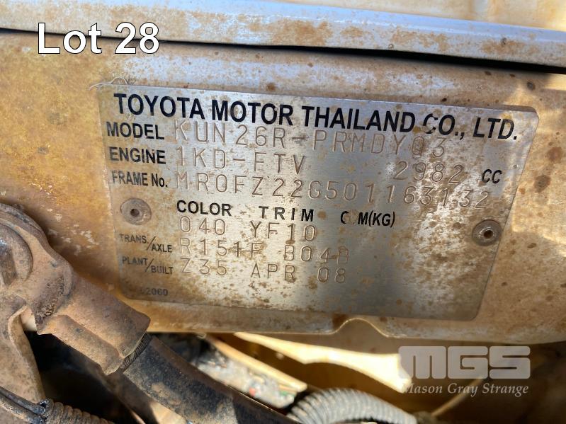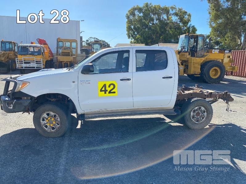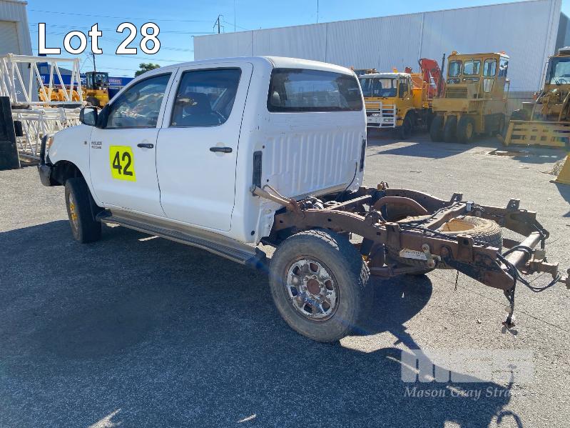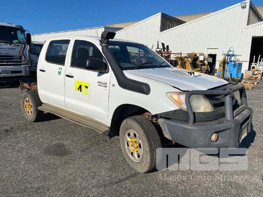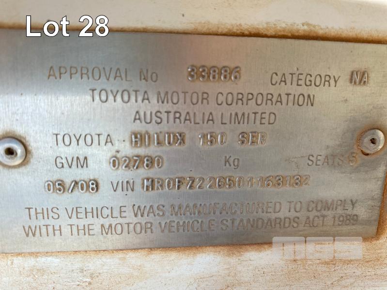 2008 TOYOTA HILUX KUN26R-PRMDY03 150 SERIES DUAL CAB CHASSIS 4 x 4 REG: XSK 181 (SA) VIN: MR0FZ22G501163132 ENG: 1KD7555703 ODO: 349,186 kms SHOWING PLANT NO: LV42 3.0 LITRE, 5 SPEED MANUAL, TURBO DIESEL, WHITE DUCO, 4 DOORS, 5 SEAT, 4 x 4 AIR BAG, AIR CON, BULL BAR, CD PLAYER, CENTRAL LOCKING, DECALS, IMMOBILISER, POWER STEERING, POWER WINDOWS, SIDE STEP, SPARE WHEEL KEY #18 (WITH PAPERS, WITH 1 KEY/S, NO OWNER'S MANUAL, NO SERVICE BOOKS) CONDITION: NO REAR SEATS - POWER WINDOWS - SWITCH ALL FAULTS