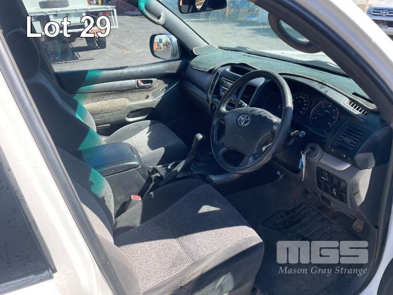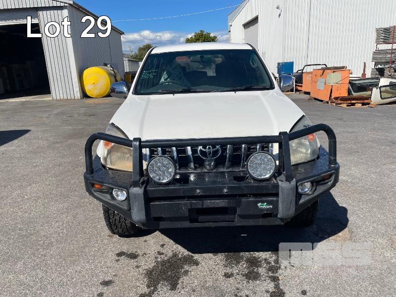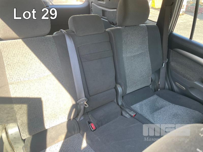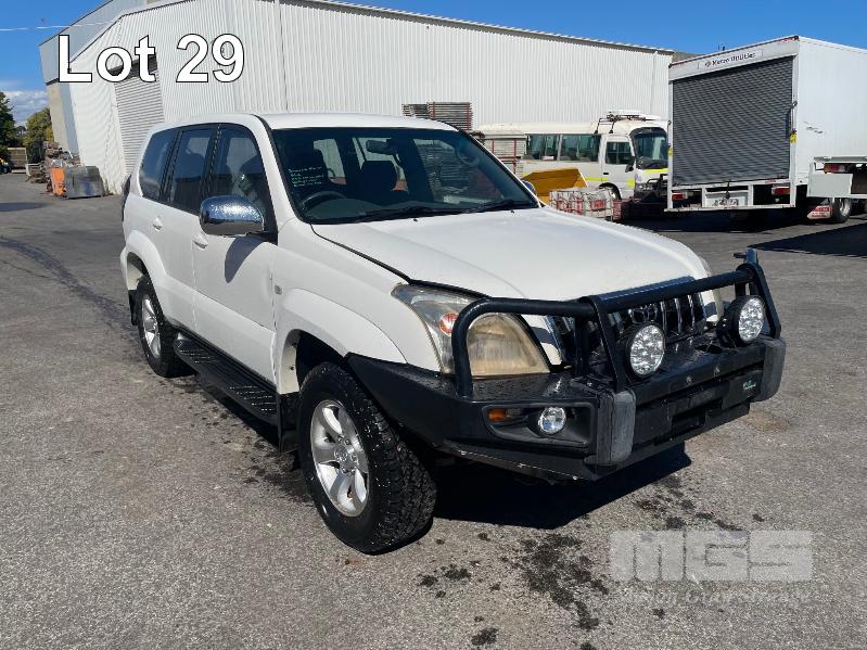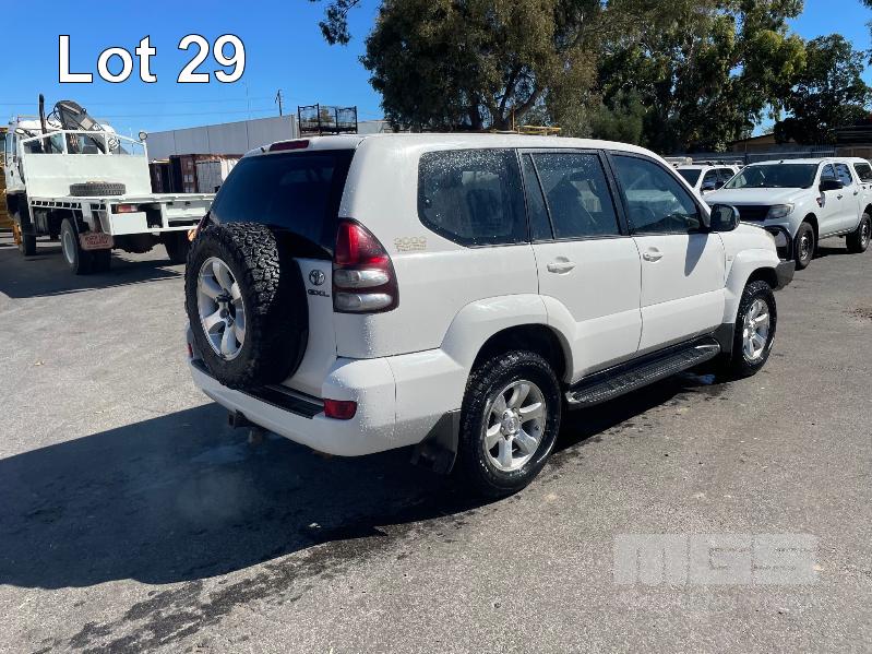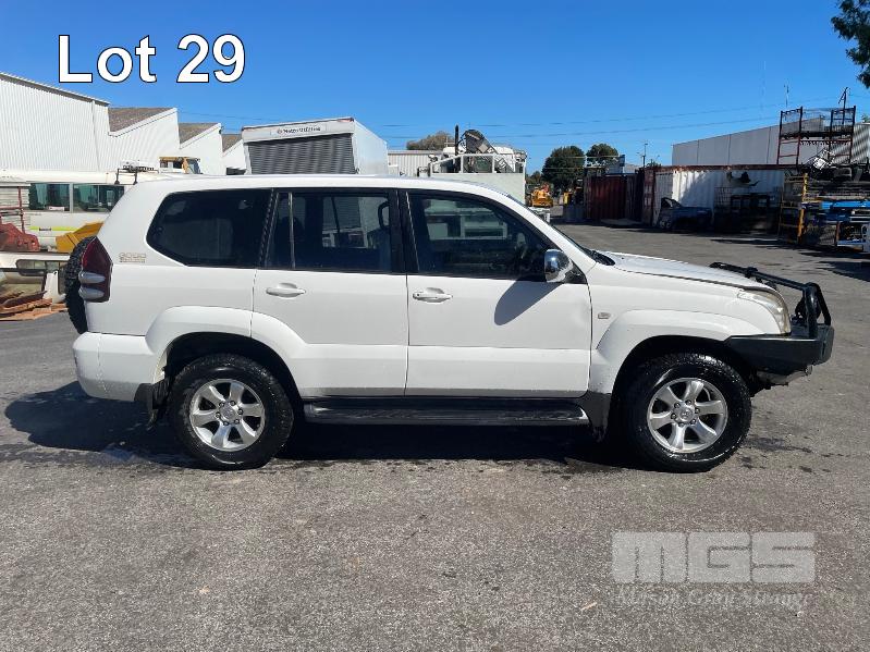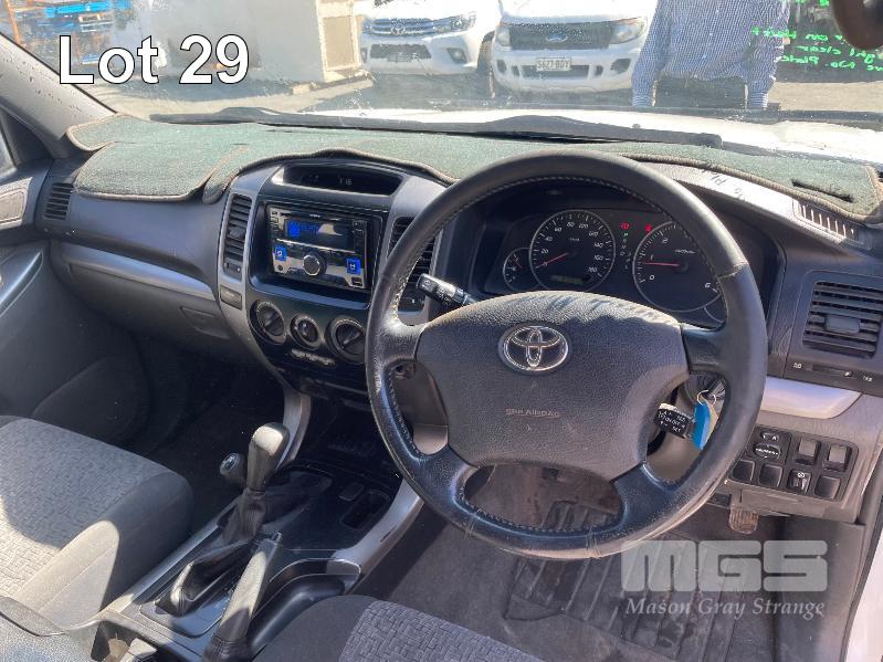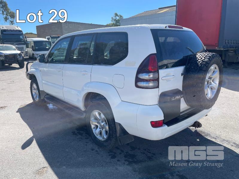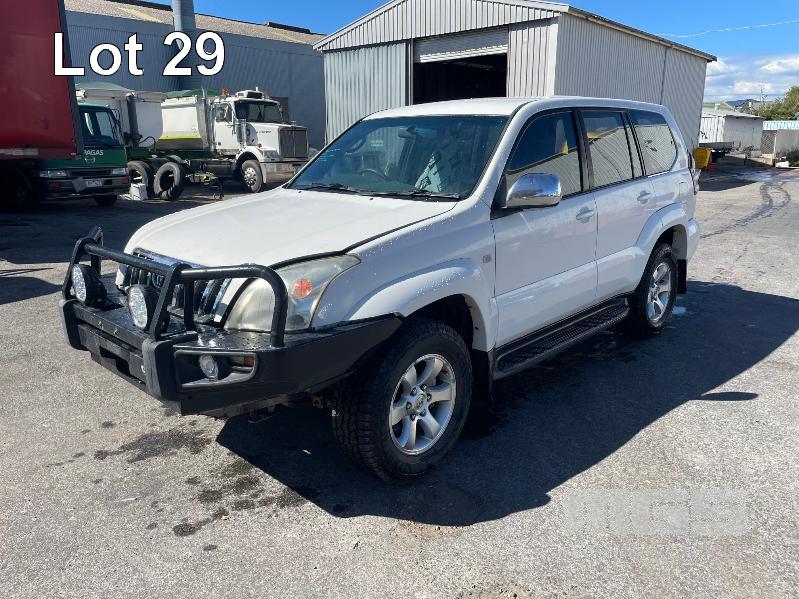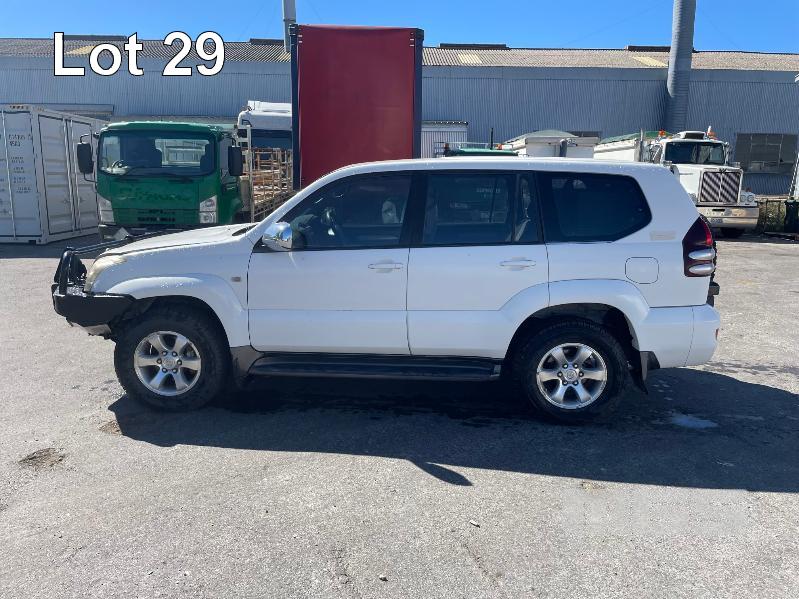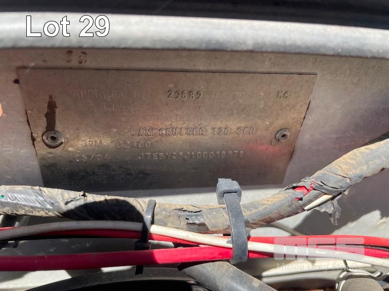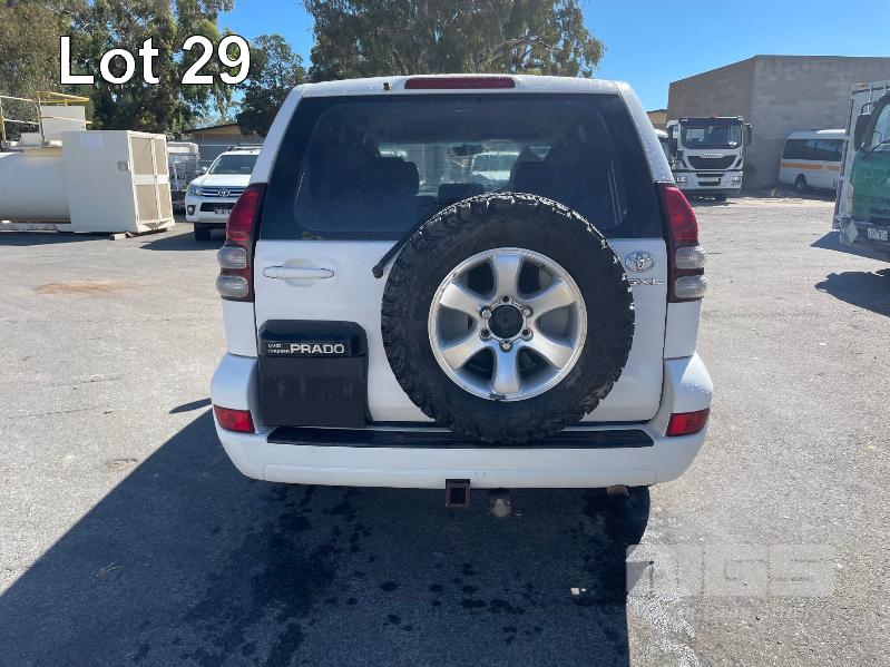 2004 TOYOTA LANDCRUISER PRADO STATION WAGON, 4x4 REG: NO PLATES VIN: JTEBY29J100018978 ODO: 370637 TURBO DIESEL, AUTO, WHITE DUCO, 5 DOORS, 7 SEAT, 4x4 AIR BAG, AIR CON, ALLOY WHEELS, BULL BAR, CD PLAYER, CRUISE CONTROL, POWER STEERING, POWER WINDOWS, SIDE STEP, SPARE WHEEL, SPOT LIGHTS, TYRES EXCELLENT CONDITION, KEY #35 (NO PAPERS, WITH OWNER'S MANUAL) CONDITION: ENGINE - BLOWING BLUE SMOKE