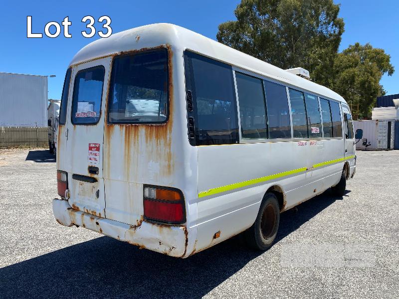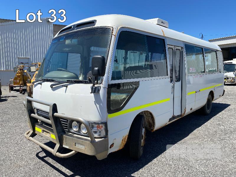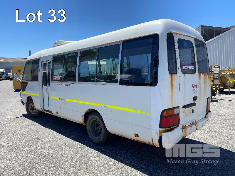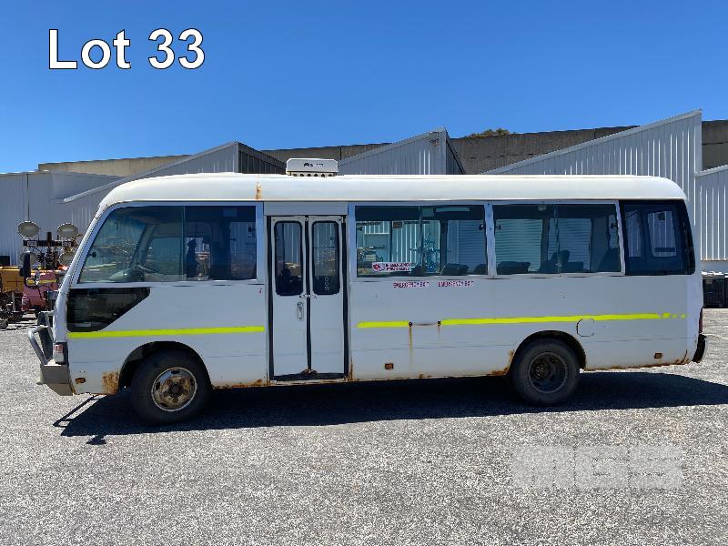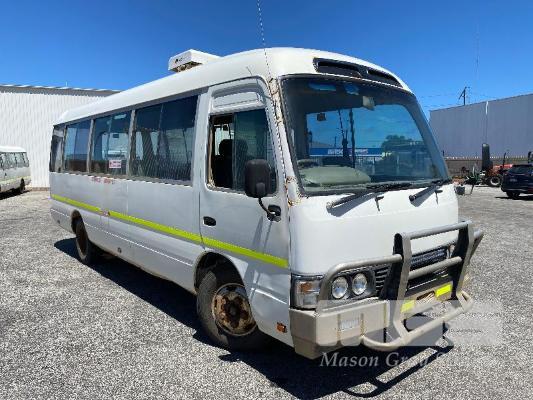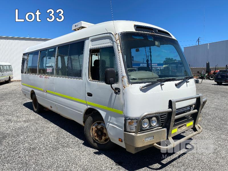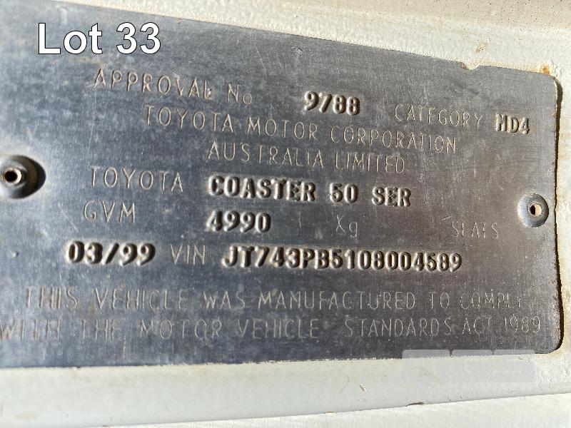1999 TOYOTA COASTER H7B50R-ZEMRSQ 50 SER BUS REG: NO PLATES VIN: JT743PB5108004589 ODO: 490,054kms SHOWING 4.2 LTR, 4 CYLINDER DIESEL, 5 SPEED MANUAL TRANSMISSION, WHITE DUCO, 3 DOORS, 22 SEAT, AIR CON, BULL BAR, GVM: 4,990, ROOF MOUNT AC KEY #30