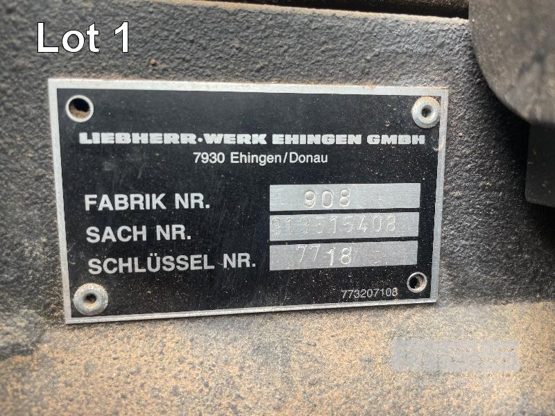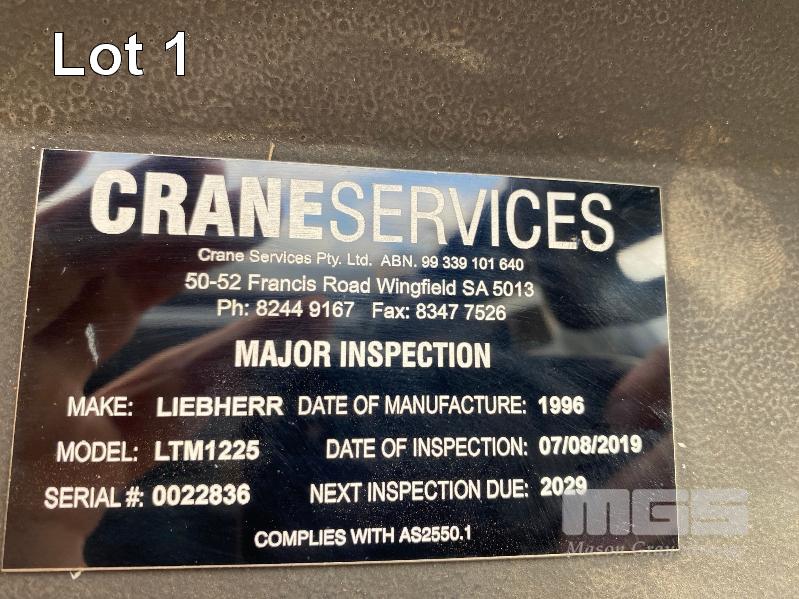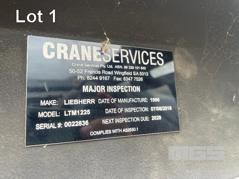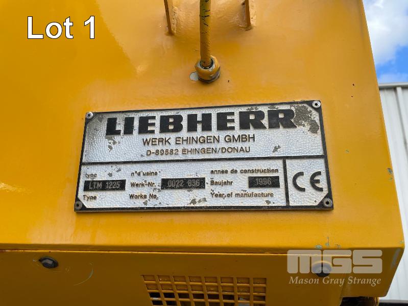 1996 LIEBHERR LTM1225 CRANE CAP: 225 TONNE MOD: LTM1225 REG: WXH 195, 6 AXLE CARRIER ODO: 57, 901kms INDICATED VORM DIESEL ENGINE MACHINE: UTN 665 S/.NO: W09666500TEL0544 GROSS WEIGHT: 72,000kg (12,000kg PER AXLE) CRANE HOURS: APPROX 14,800 (SERVICE BOOK) WERK: 0022836 FAB: 587 SACH: 9136529 SCHUSSEL: 11 WITH CRANE OPERATORS MANUAL & SPARE PARTS CATALOGUE LAST MAJOR INSPECTION DATE: 07/08/2019 NEXT MAJOR INSPECTION DUE : 2029 INCLUDES: MULTIPLE FLY JIBS & SECTIONS, COUNTER WEIGHTS, LUFT HOOK, NEW LUFF CYLINDER, NEW ENGINE LESS THAN 5000KMS AND TRANSFUR BOX.
