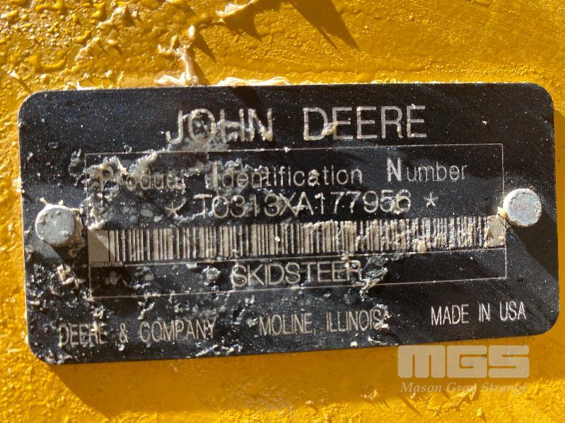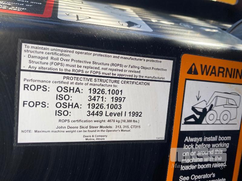 SKID STEER LOADER, JOHN DEERE MOD: 313 PIN: T03IXA177956 JOHN DEERE 45HP DIESEL ENGINE MOD: 4024TT012 HOURS: 343.6 SHOWING FITTED WITH 4 IN 1 BUCKET WIDTH: 1540mm ROPS & FOPS PROTECTION SPARE WHEEL, 2 x KEYS & BOOKS KEY #41