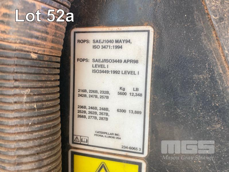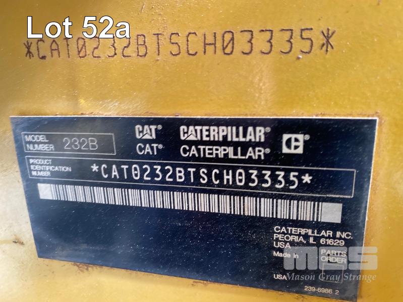 CATERILLAR 232B2 SKID STEER LOADER PIN: CAT0232BTSCH03335 HOURS: 2825 SHOWING CAT., C2.2, 4 CYLINDER DIESEL, REVERSING CAMERA WITH LCD SCREEN G.P. BUCKET 1700mm WIDE KEY #7 (NO PAPERS, WITH 1 KEY/S, NO OWNER'S MANUAL, NO SERVICE BOOKS)
