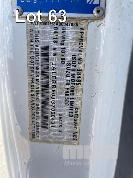 2018 ISUZU FRR500 4X2 TIPPER TRUCK REG: XS 30 BB VIN: JALFRR90JG7000434 ENG: 4HK1681489 ODO: 59,970kms SHOWING LENGTH: STEEL 4m BODY MANUAL TRANSMISSION, DIESEL, 3 SEAT, AIR CON, CD PLAYER, DROP SIDES 2 WAY TAILGATE KEY #50 (WITH PAPERS, WITH 1 KEY/S)