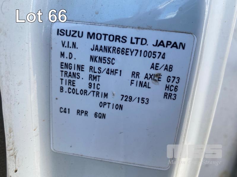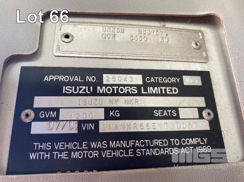 2001 ISUZU NKR200 4x2 PANTEC REG: S698 CVJ (SA) VIN: JAANKR66EY7100574 ENG: 4HF1823361 ODO: 154,650kms SHOWING GVM: 4,200kg GCM: 5,450kg 4 CYLINDER DIESEL, 5 SPEED MANUAL TRANSMISSION, SPRING SUSPENSION, WHITE DUCO, 2 DOORS, 3 SEAT, AIR CON, STEEL RIMS, BODY SIZE: 3200 x 2000 x 1500mm (H) 4 x ROLLER DOOR ACCESS ON SIDES SPARE WHEEL KEY #1 (WITH PAPERS, WITH 1 KEY/S)