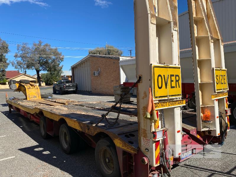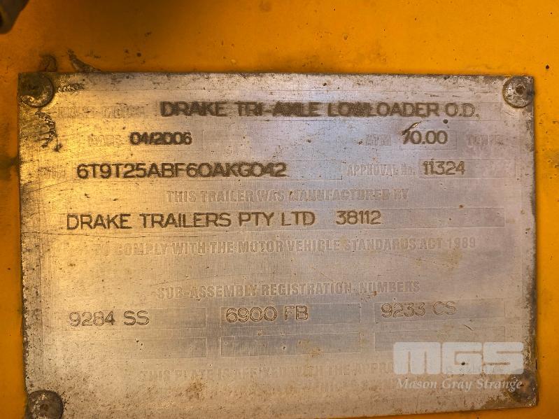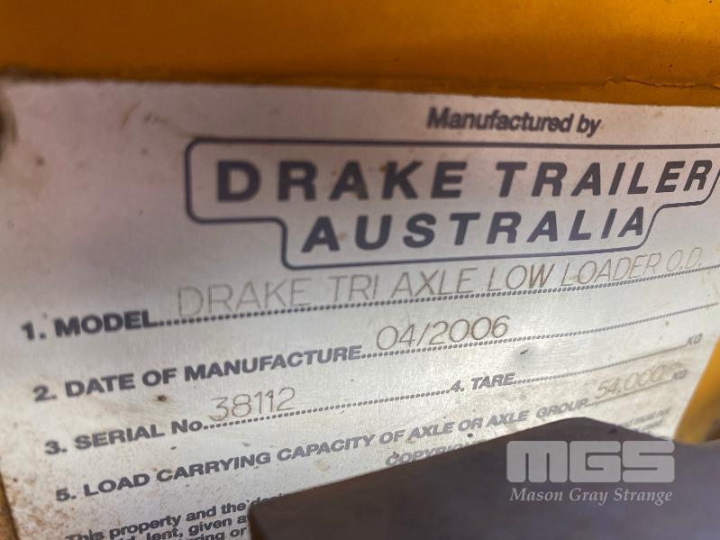 2006 DRAKE LOW LOADER TRI AXLE HYDRAULIC GOOSE NECK MODEL: LOW LOADER O.D. REG: NO PLATES VIN / CHASSIS: 6T9T25ABF60AKGO42 ATM: 70,000kg REAR HYDRAULIC LOAD RAMPS, 2 x SPARE WHEELS, AUTO GREASE SYSTEM, 2 x UNDER TRAY TOOL BOXES, FRONT MOUNT ALLOY WATER TANK REAR PIN HITCH