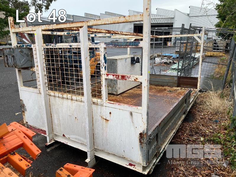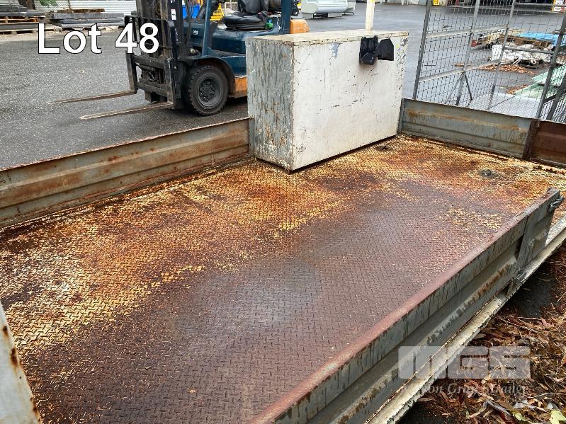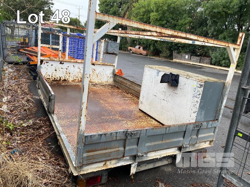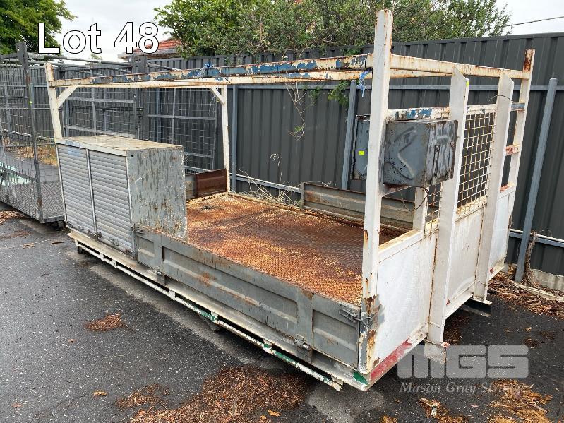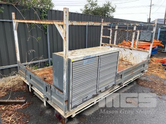 TRUCK TRAY BODY 2040 x 3400mm CHECKER PLATE STEEL DECK OVERHEAD CARRY RAILS, HINGED SIDES & REAR 2 x STORAGE CABINETS