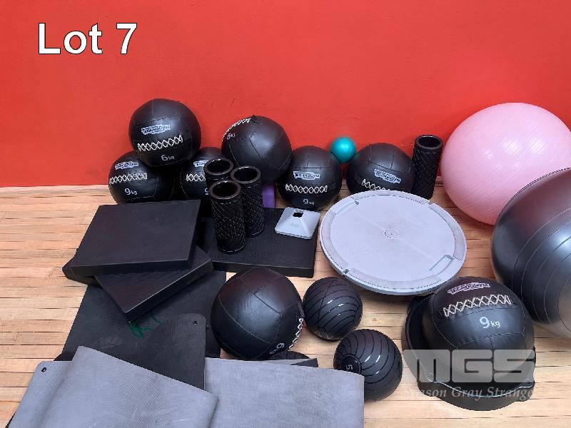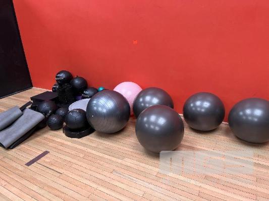 6 x TECHNOGYM MEDICINE BALLS, 6 & 9kg, 2 x ROLLERS, 5 x GYM BALLS, YOGA BLOCKS & STABILITY TRAINER