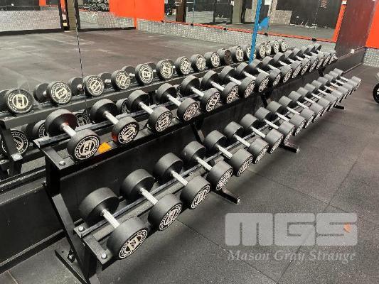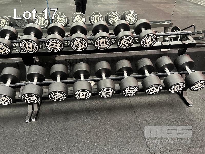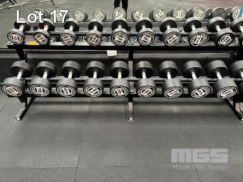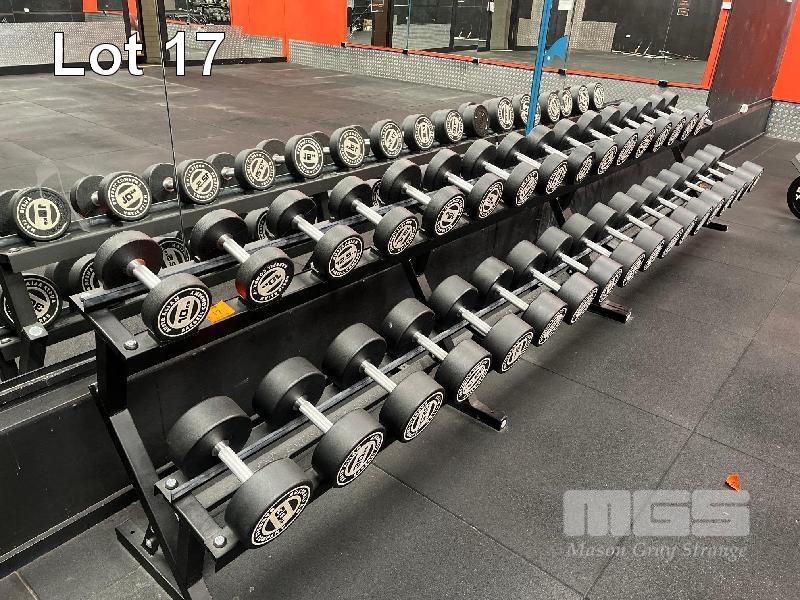 34 x AUSTRALIAN BARBELL COMPANY RUBBER COATED DUMBBELLS, 10kg TO 50kg PAIRS, 2 x AUSTRALIAN BARBELL COMPANY RACKS