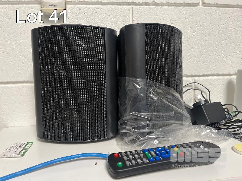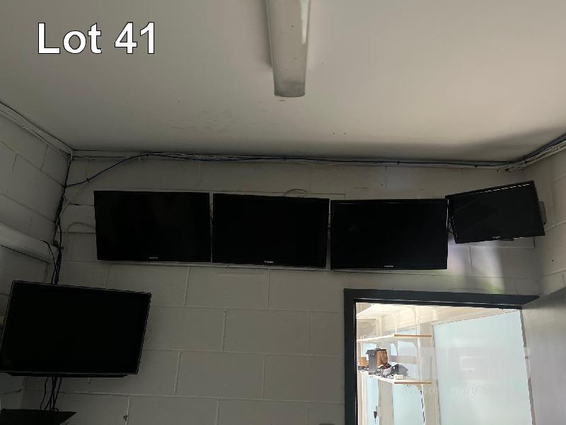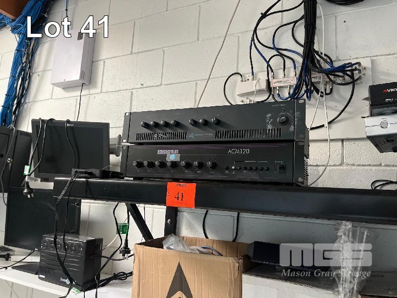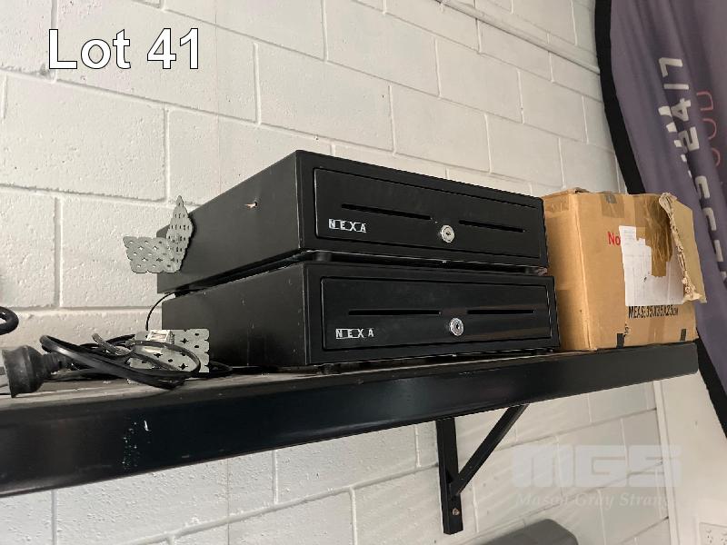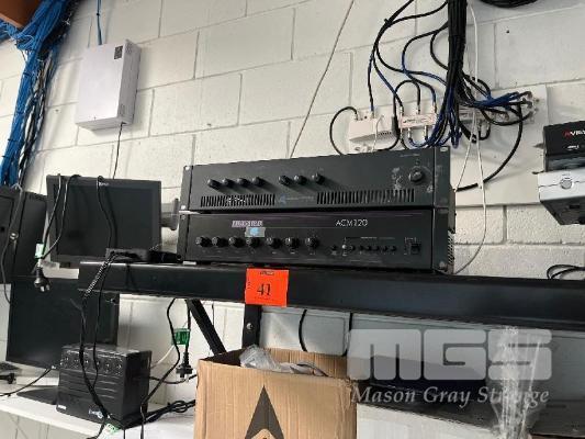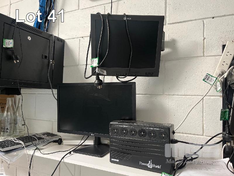 7 x ASSORTED SIZE MONITORS 2 x CASH DRAWERS AUSTRALINA MONITOR AMP, MOD: AM1250 AUDIO TELEX AMP, MOD: ACM120 HIKVISION DVR RECORDER POWER SHIELD UPS PAIR GIANT WALL SPEAKERS, NEW! WALL MOUNT DATA CABINET WITH 5 x 24 PORT SWITCHES