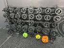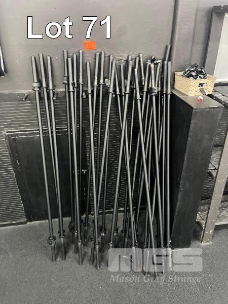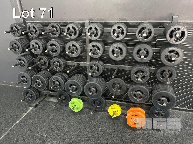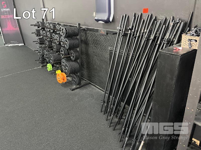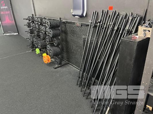 27 x PUMP BARS WITH LARGE QUANTITY ASSORTED WEIGHTS TO SUIT, AUSTRALIAN BARBELL COMPANY & FREE STANDING RACK