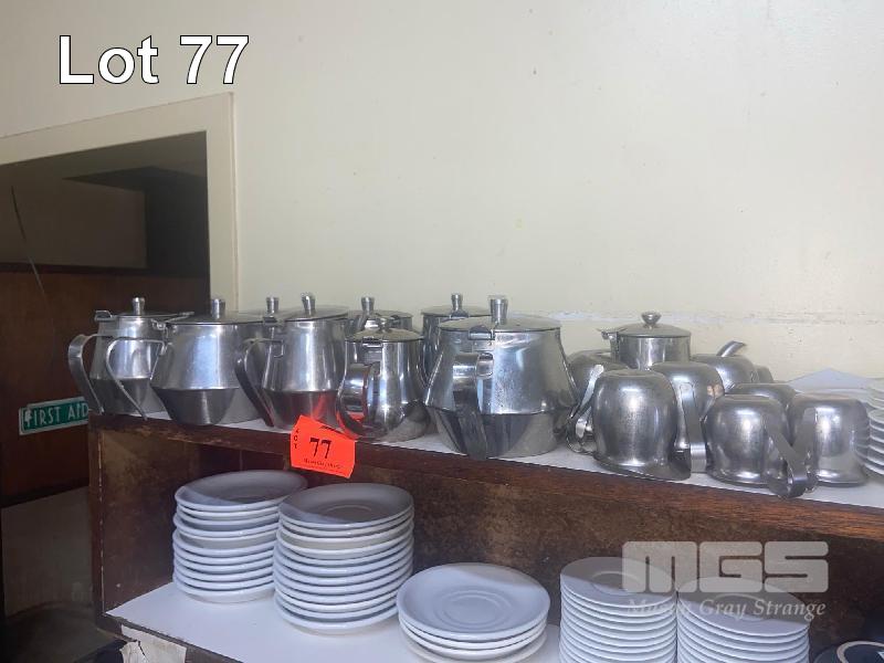 STAINLESS STEEL TEA POTS & SMALL STAINLESS STEEL MILK POTS, (APPROX 17 x PIECES)