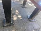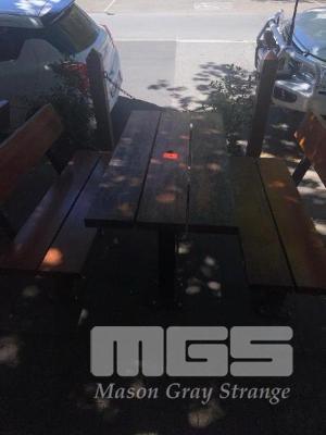 SOLID TIMBER OUTDOOR CAFE TABLES, 1200 x 600mm WITH 2 x BENCHES,SOLID STEEL DUAL PEDESTAL BASES, (EASY UNBOLT & REMOVE)