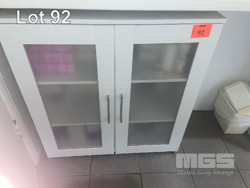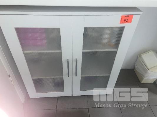 WHITE LOWLINE TIMBER STORAGE CUPBOARD, 800 (W) x 870 (H) x 400mm (D) WITH GLASS INLAYS