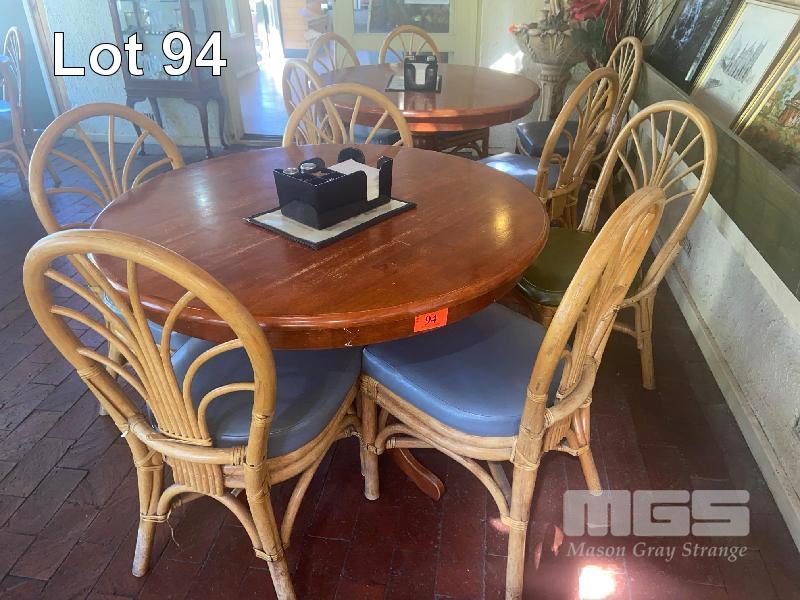 4 x TIMBER CAFE TABLES, 1000mm ROUND, CENTRE PEDESTAL & 5 x TIMBER CHAIRS