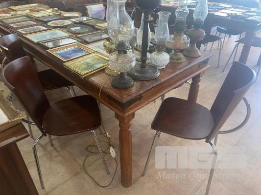RECTANGULAR TIMBER CAFE TABLE, MALAYSIAN TEAK, 1500 x 900mm, 4 LEG WITH 5 x BENTWOOD CHROME LEG CHAIRS