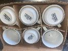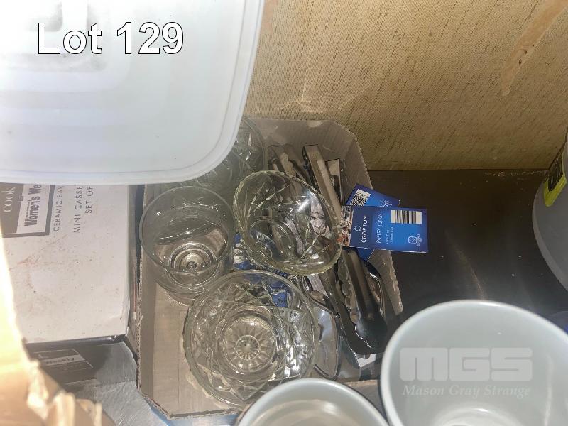 THE ASSORTED LOT INC GLASS DESSERT BOWLS, CUPS, 3 x CARTONS (600) NEW CUPS, ASSORTED CHINA & UTENSILS