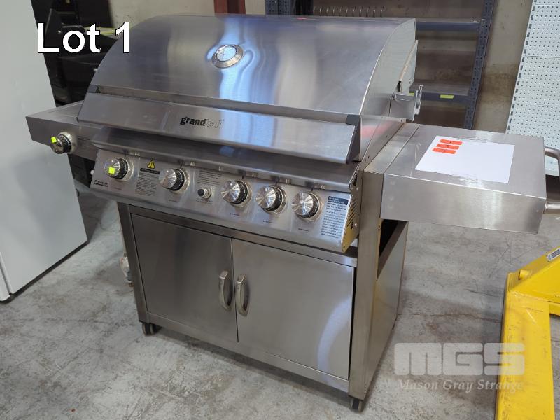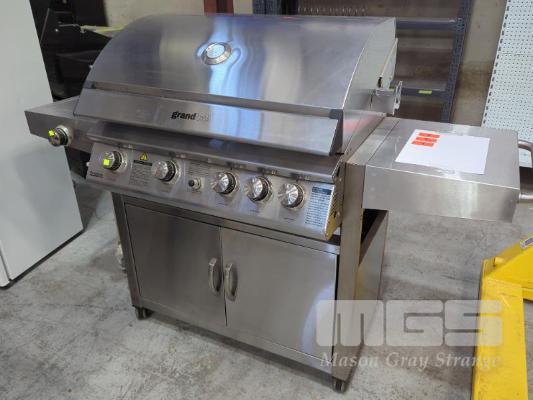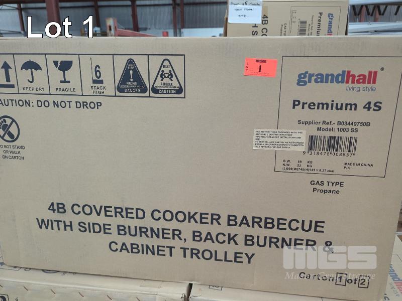 GRANDHALL PREMIUM 4S MOBILE STAINLESS STEEL COVERED GAS BBQ ON CABINET TROLLEY. FEATURES STAINLESS STEEL HOOD, 2-DOOR STAINLESS STEEL CABINET TROLLEY WITH 4-BURNERS PLUS BACK-BURNER, SIDEBURNER AND ELECTRONIC IGNITION. MODEL 1001SPP NEW IN BOX (2 X BOXES). ORP $1,599