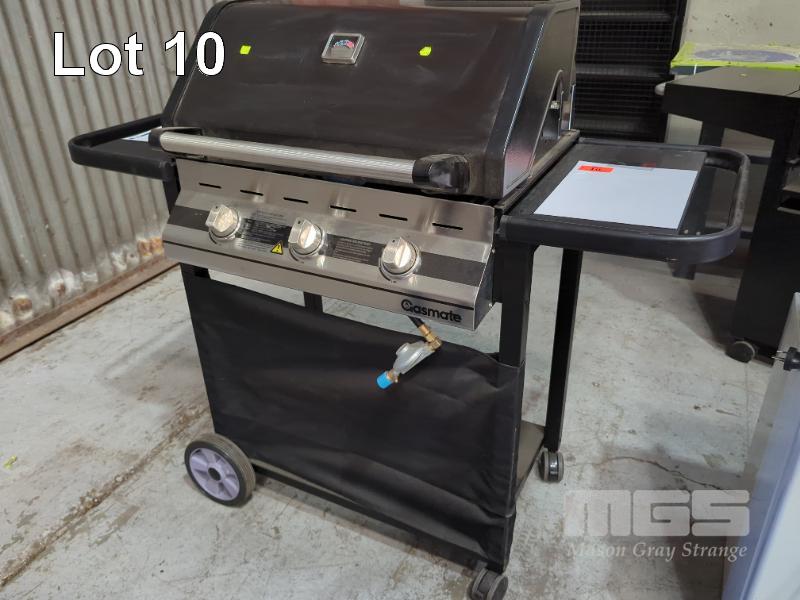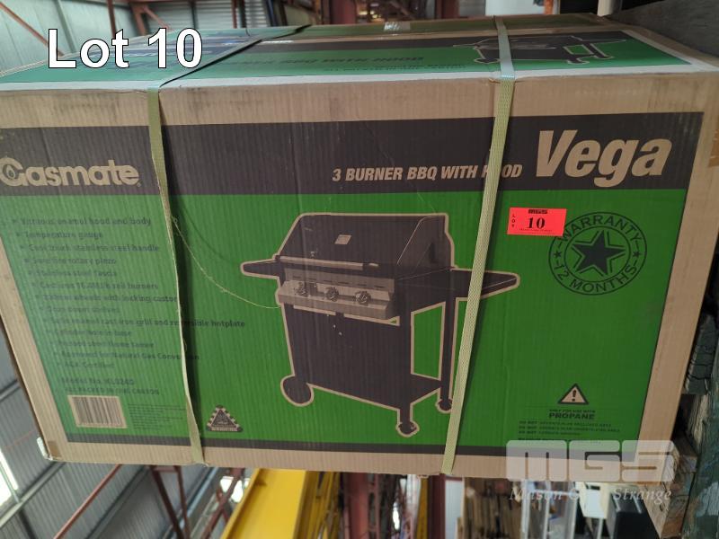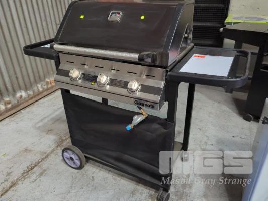 GASMATE VEGA MOBILE 3-BURNER COVERED GAS BBQ ON 2-DOOR CABINET TROLLEY MODEL KLO24D NEW IN BOX. ORP $399 NO GST