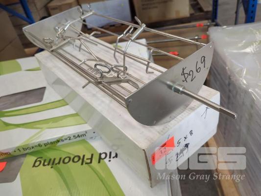 EZQ EIGHT INCH ROTISSERIE CRADLE - MEDIUM (21.5 INCH LONG) 21.5 X 8" STAINLESS STEEL ROTISSERIE CRADLE, HANDLE, CLAW CLAMPS & CLAWS. * E-Z QUE ROTISSERIE BASKET SYSTEM * * NO MOTOR * ORP $239.00 NO GST