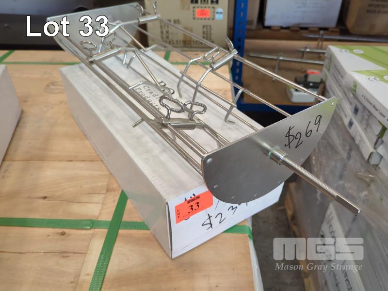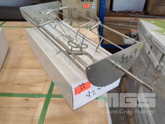 EZQ EIGHT INCH ROTISSERIE CRADLE - MEDIUM (21.5 INCH LONG) 21.5 X 8" STAINLESS STEEL ROTISSERIE CRADLE, HANDLE, CLAW CLAMPS & CLAWS. * E-Z QUE ROTISSERIE BASKET SYSTEM * * NO MOTOR * ORP $239.00 NO GST