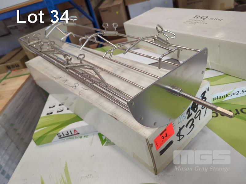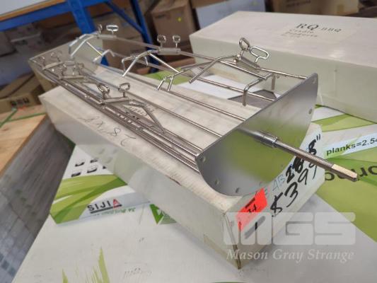 EZQ EIGHT INCH ROTISSERIE CRADLE - LARGE (28 INCH LONG) 28 X 8" STAINLESS STEEL ROTISSERIE CRADLE, HANDLE, CLAW CLAMPS & CLAWS. * E-Z QUE ROTISSERIE BASKET SYSTEM * * NO MOTOR * ORP $399.00 NO GST