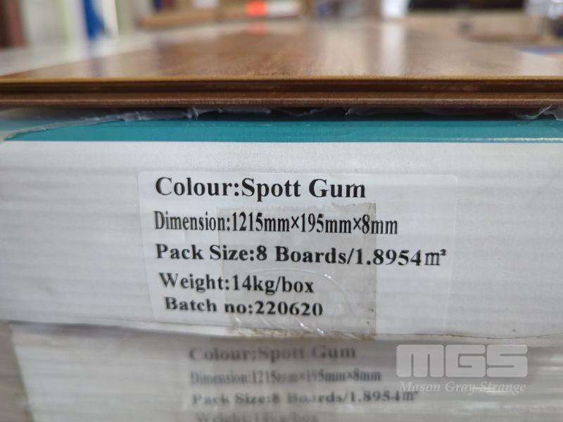 10 PACKS OF 8.0 MM WATER-RESISTANT LAMINATE FLOORING IN COLOUR SPOTTED GUM. SIZE 1,215 X 195 X 8 MM (W D H). 1.895 M2 PER BOX. 18.95 M2 TOTAL. ALL NEW PACKS.