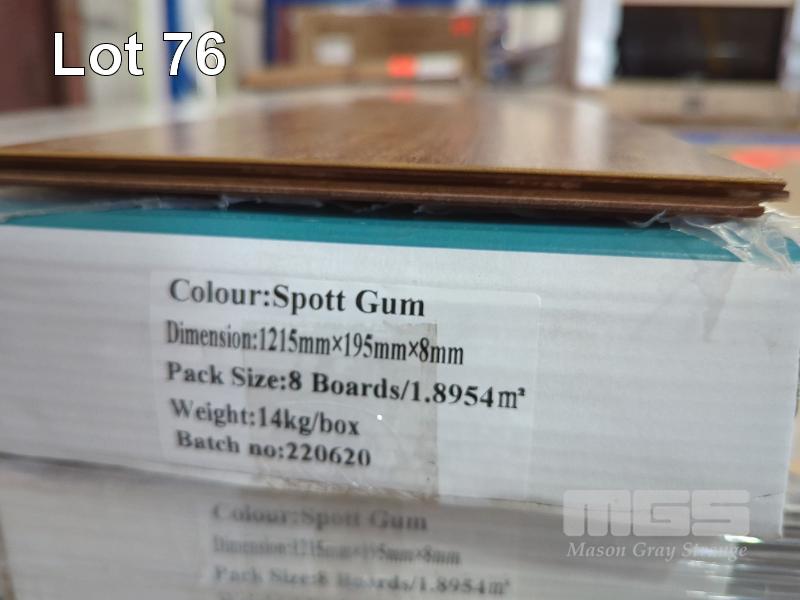 10 PACKS OF 8.0 MM WATER-RESISTANT LAMINATE FLOORING IN COLOUR SPOTTED GUM. SIZE 1,215 X 195 X 8 MM (W D H). 1.895 M2 PER BOX. 18.95 M2 TOTAL. ALL NEW PACKS.