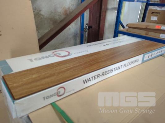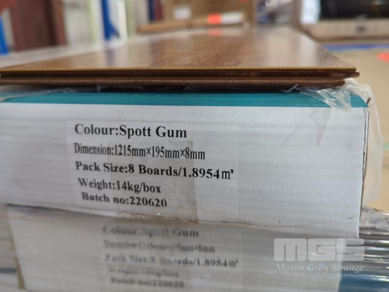 10 PACKS OF 8.0 MM WATER-RESISTANT LAMINATE FLOORING IN COLOUR SPOTTED GUM. SIZE 1,215 X 195 X 8 MM (W D H). 1.895 M2 PER BOX. 18.95 M2 TOTAL. ALL NEW PACKS.