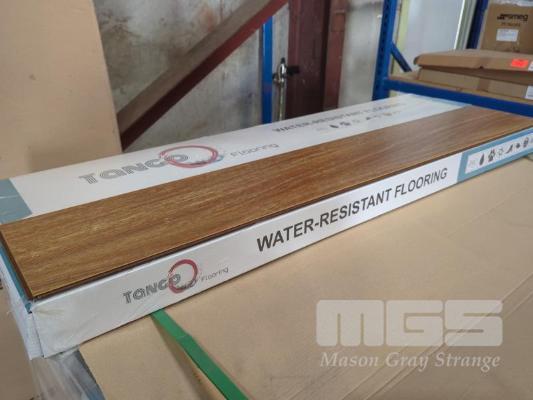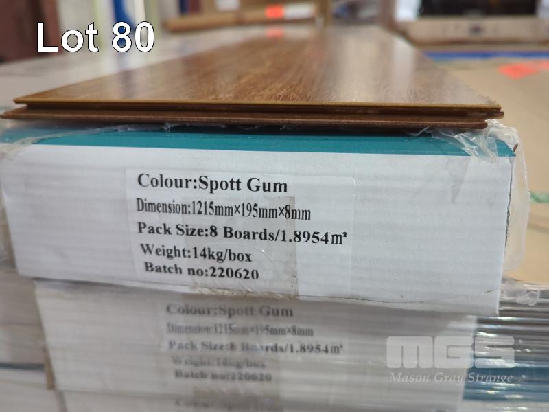 10 PACKS OF 8.0 MM WATER-RESISTANT LAMINATE FLOORING IN COLOUR SPOTTED GUM. SIZE 1,215 X 195 X 8 MM (W D H). 1.895 M2 PER BOX. 18.95 M2 TOTAL. ALL NEW PACKS.