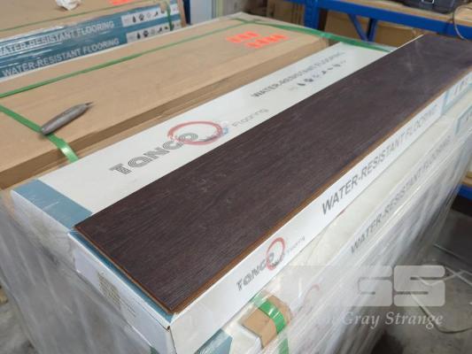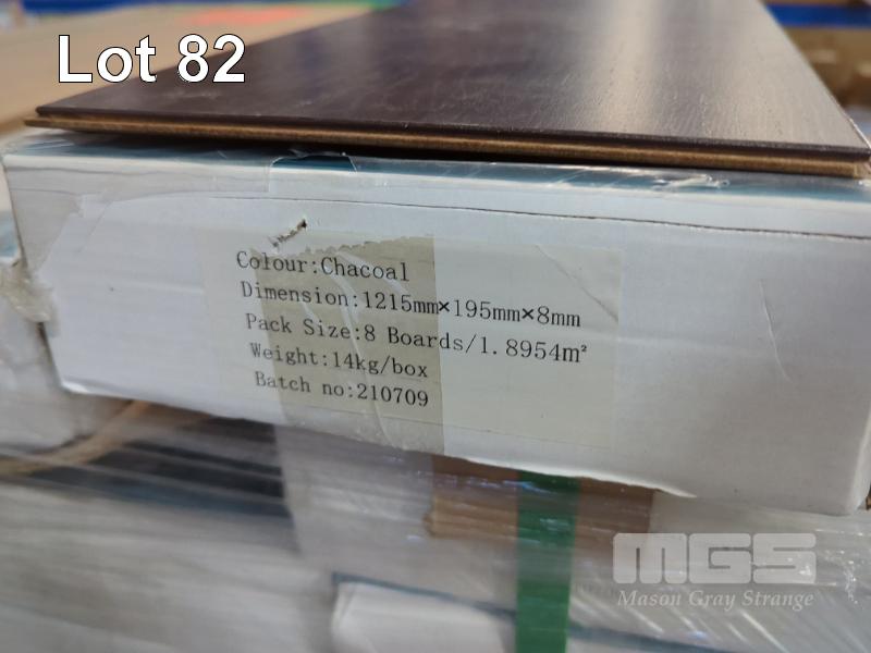 10 PACKS OF 8.0 MM WATER-RESISTANT LAMINATE FLOORING IN COLOUR CHARCOAL. SIZE 1,215 X 195 X 8 MM (W D H). 1.895 M2 PER BOX. 18.95 M2 TOTAL. ALL NEW PACKS.