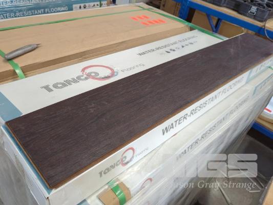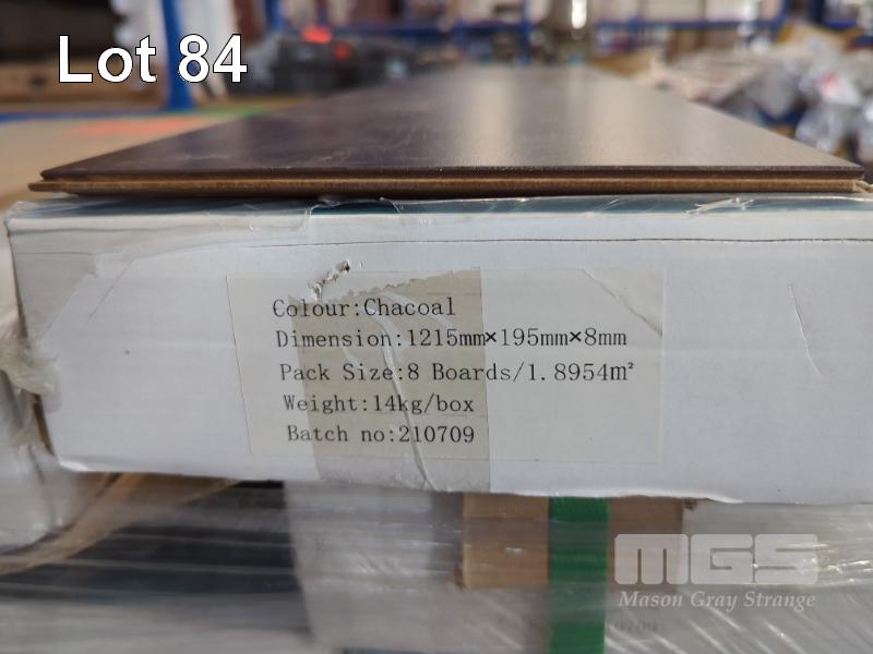 10 PACKS OF 8.0 MM WATER-RESISTANT LAMINATE FLOORING IN COLOUR CHARCOAL. SIZE 1,215 X 195 X 8 MM (W D H). 1.895 M2 PER BOX. 18.95 M2 TOTAL. ALL NEW PACKS.