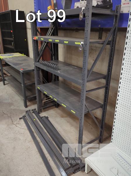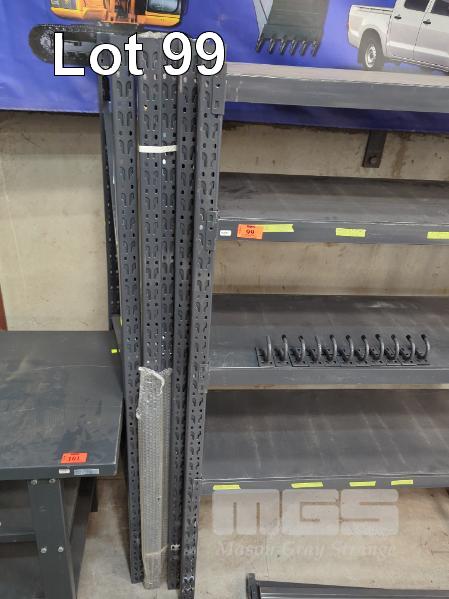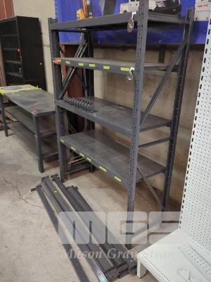 METAL SHELVING UNIT AND COMPONENTS COMPRISING 1 X COMPLETE 4-TIER UNIT 1,305 X 450 X 1,805 MM (W D H). 2 X BEAMS SUIT 1,200 MM PANEL SHELF. 4 X BEAMS SUIT 1,500 MM PANEL SHELF. 2 X BEAMS SUIT 1,500 MM TIMBER SHELF. 3 X UPRIGHTS 1,805 X 450 MM (H W). 10 11 X ACCESSORY HOOKS.