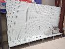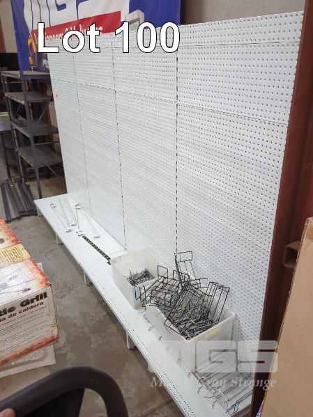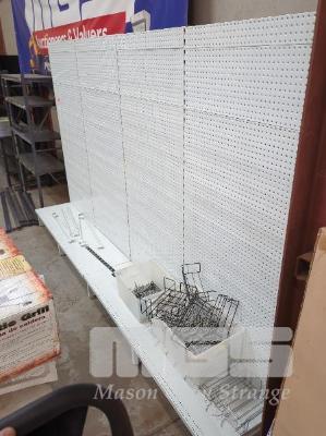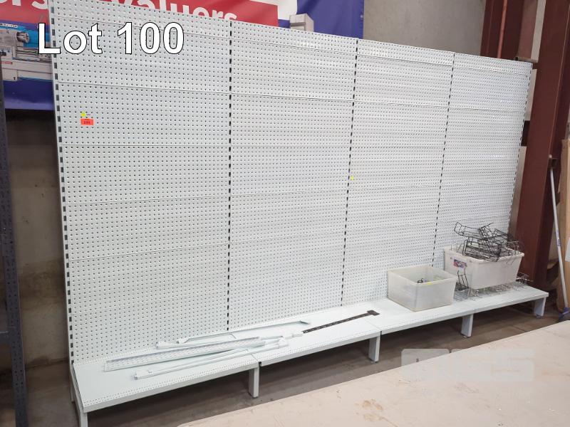 COMMERCIAL RETAIL 4-BAY METAL PEGBOARD GONDOLA SHELVING UNIT. 3,600 X 530 X 2,120 MM (W D H). SINGLE SIDED. BASE SHELVES ONLY. QUANTITY OF PEGS & BASKETS.