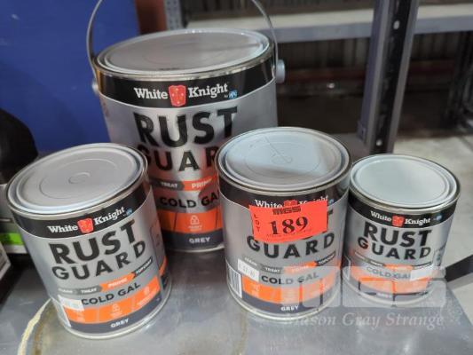 1 X 4.0 L TIN, 2 X 1.0 L TINS AND 1 X 0.5 L TIN WHITE KNIGHT RUST GUARD COLD GAL PRIMER PAINT - GREY