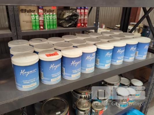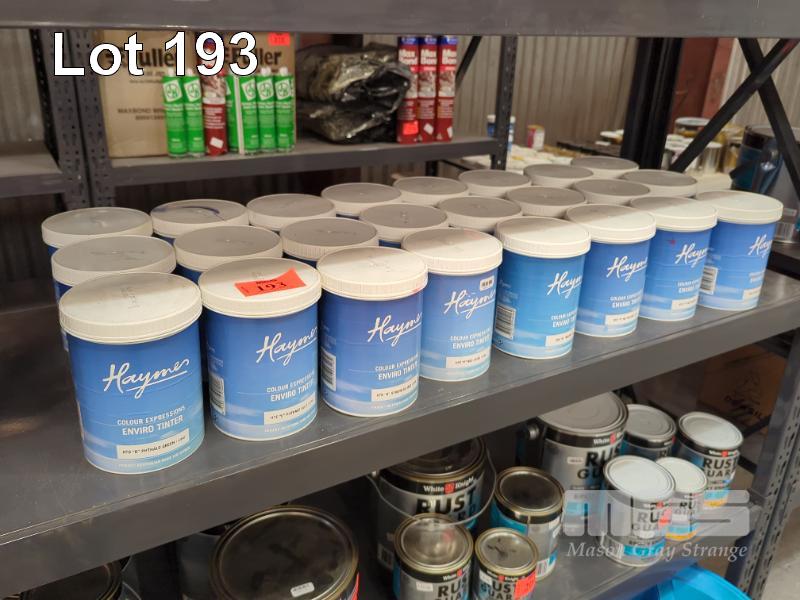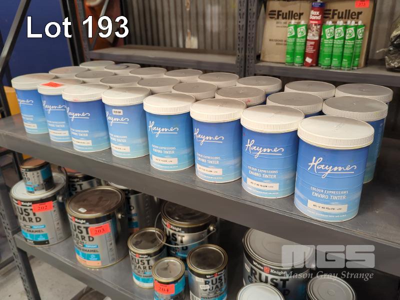 24 X 1.0 L HAYMES COLOUR EXPRESSIONS PAINT TINTS. COMPRISING: 3 @ HTJ "J" HD YELLOW 3 @ HTA "A" YELLOW 3 @ HTE "E" PHTHALO BLUE 3 @ HTF "F" RED OXIDE 3 @ HTD "D" PHTHALO GREEN 3 @ HTM "M" MAGENTA 3 @ HTR "R" HD RED 3 @ HTK "K" STRONG HD RED (1 X SHELF)