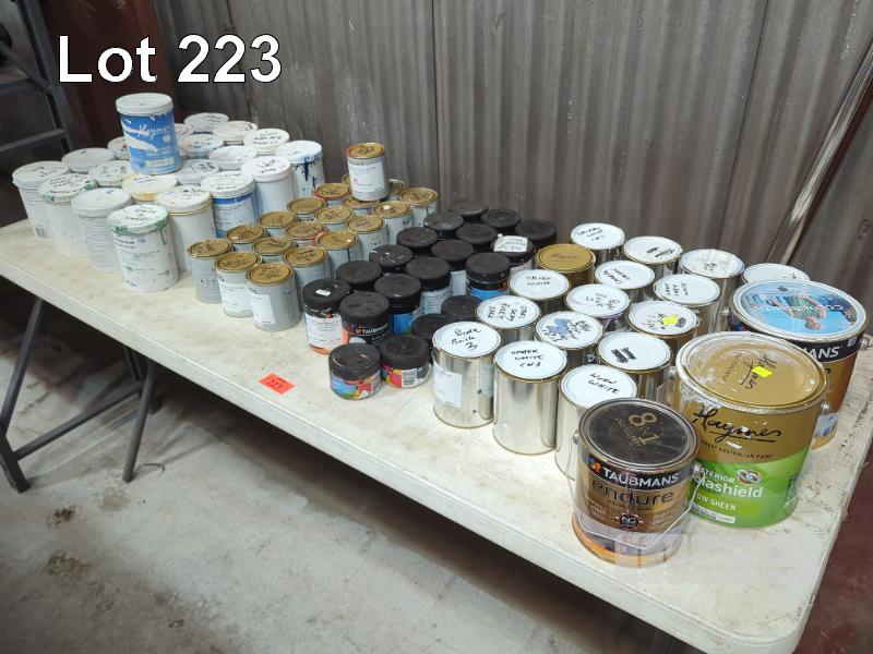 QUANTITY OF PAINT SAMPLES AND PART PAINT TINS. MULTIPLE BRANDS, VARIOUS COLOURS. 80 ITEMS APPROX. (1 X TABLE).