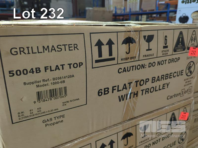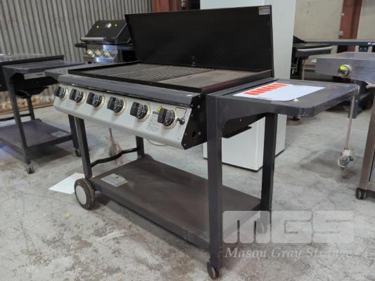 GRILLMASTER MOBILE FLAT TOP GAS BBQ 6-BURNER WITH TROLLEY. MODEL 1000-6B. NEW IN BOX. ORP $699