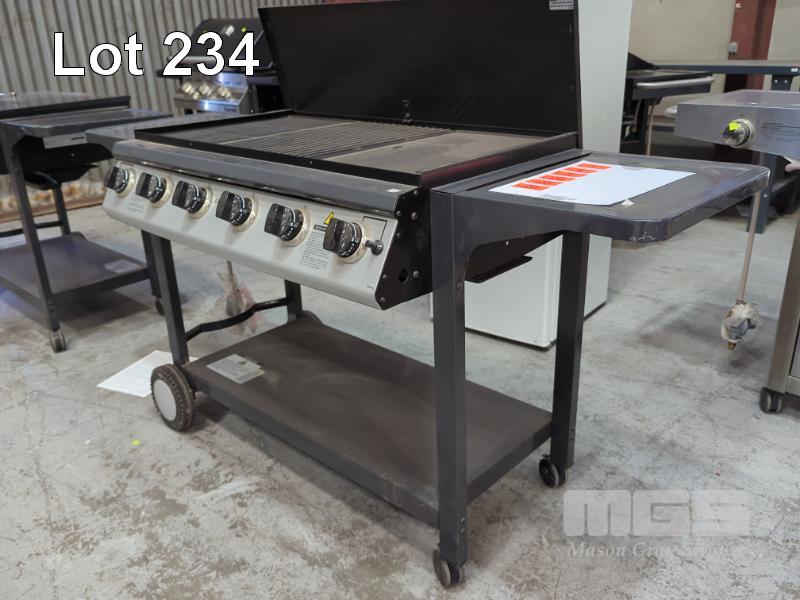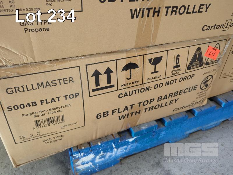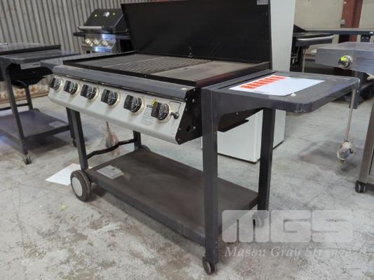 GRILLMASTER MOBILE FLAT TOP GAS BBQ 6-BURNER WITH TROLLEY. MODEL 1000-6B. NEW IN BOX. ORP $699